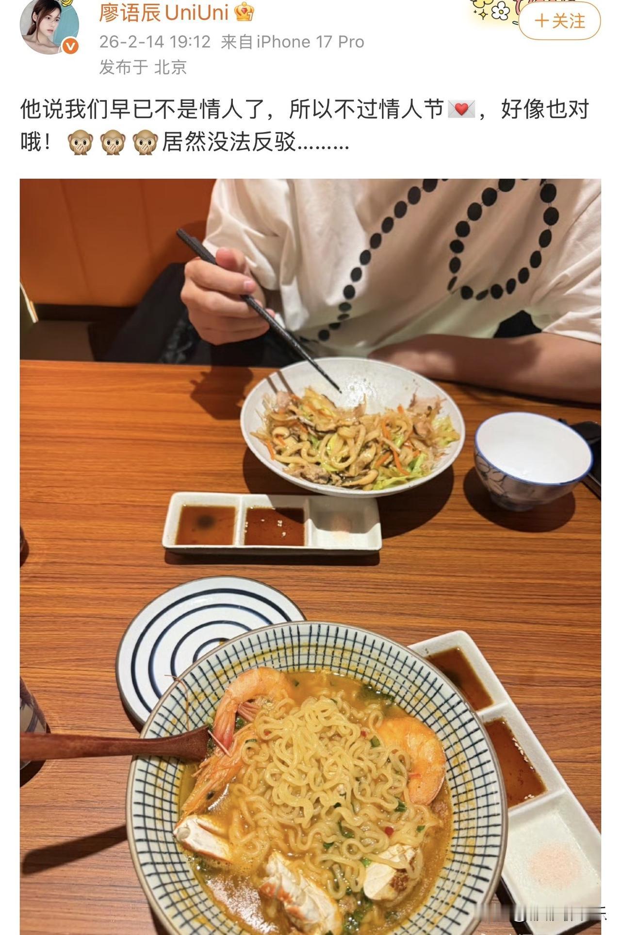 苏醒老婆高调发文:他说我们早已不是情人。 2月14日,在这个浪漫的日子里,苏醒老婆廖雨辰在社交平台发布动态,暗戳戳秀了个恩爱。 她发文说: “他说我们早已不是情人了,所以不过情人节,好像也对哦,居然无法反驳。” 她还配了一张图片,图片上是两人吃的饭,她吃着一碗海鲜拉面,苏醒则吃着一碗炒面。 从廖雨辰发布的动态中可以看出,这对不是情人的老夫老妻,真的很恩爱。 嘴上说着,不是情人了,不过情人节,但还是单独出去吃饭,这个饭一看都是老夫老妻的标配。 虽然没有晒出节日礼物,但以苏醒这么爱老婆的样子,要么是转账,要么是送了别的。 苏醒比廖雨辰大11岁,在苏醒眼里,他把老婆当女儿一样宠溺。 平时苏醒忙于工作,廖雨辰则在家带孩子,她把两个儿子教育的很好。 虽然苏醒很忙,但从未缺席过老婆和两个孩子的重要时刻。 这才是一个好男人应该拥有的特质。