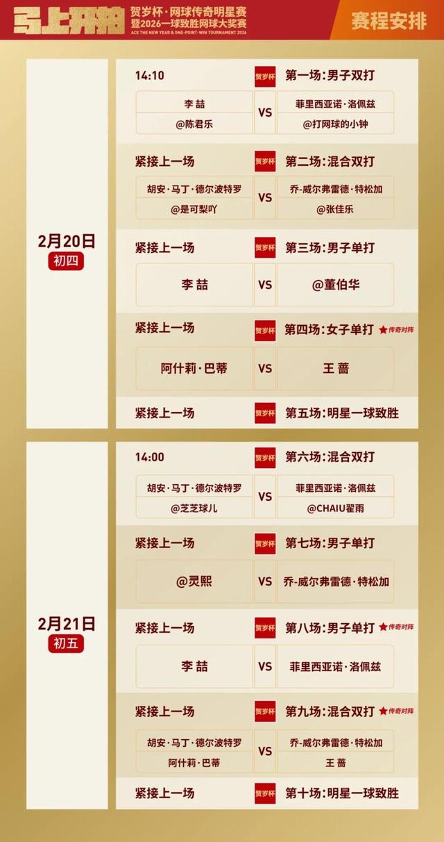本届贺岁杯核心看点——网球传奇明星赛将于2月20日至21日重磅上演。澳大利亚前世界第一、三届大满贯冠军巴蒂首次来华参赛,美网冠军德尔波特罗、法国名将特松加、西班牙大师赛总监洛佩兹,与全运会冠军王蔷、李喆联袂出战,搭配8位网球达人组队对抗。赛事设置男女单打、男双、混双及特色“一球致胜”对抗,以团队总积分决胜负,节奏紧凑、悬念拉满,每一拍都牵动战局。