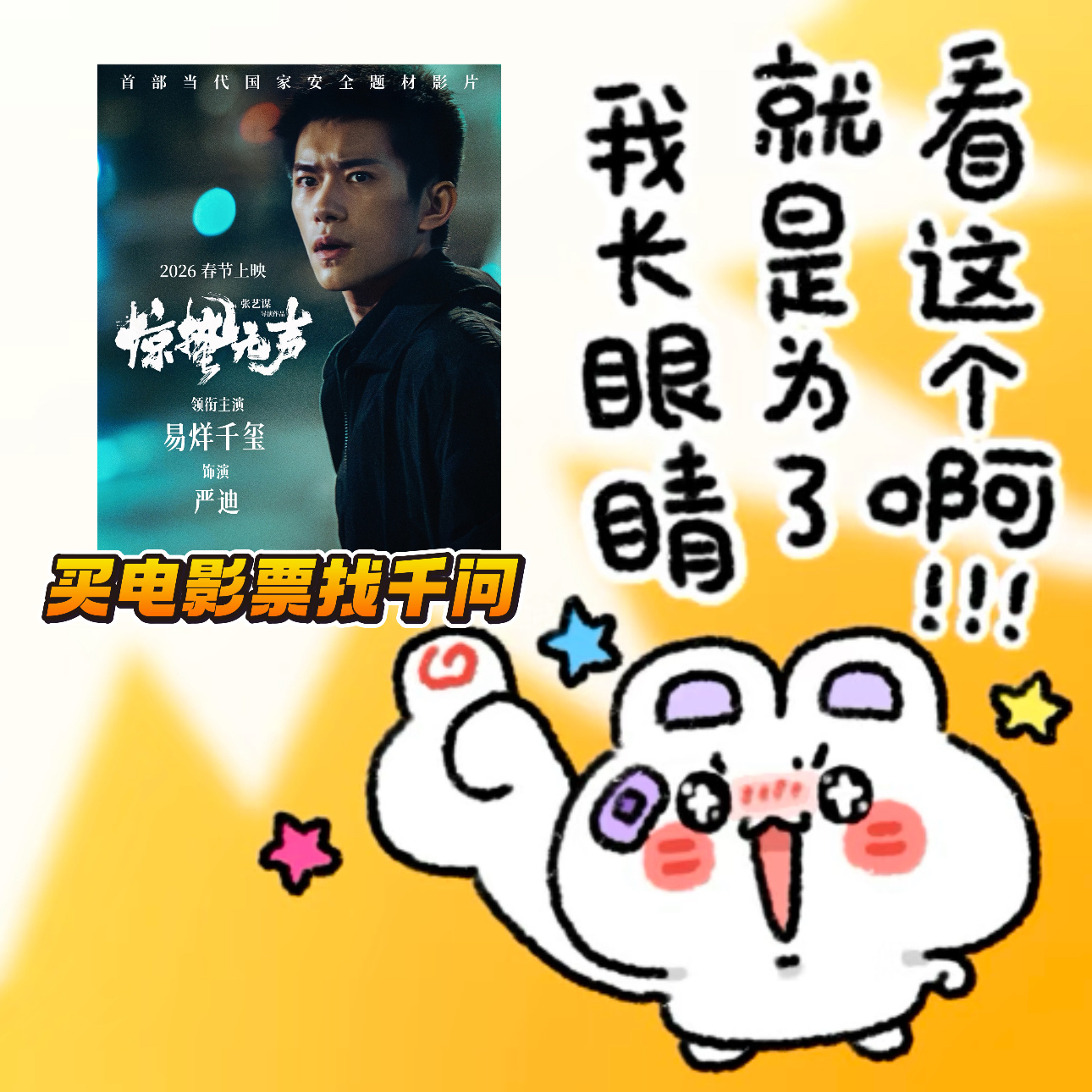 上千问请你看惊蛰无声 谁过年还不看几场电影啊!特别是今年的《惊蛰无声》,必须安排上!现在上千问,新用户领超级免单卡,买电影票立减25元!邀请身边的新用户,还能再得卡,最多10张,足够刷完整个春节档。一键买票、智能选座,方便又省心。这个春节,让千问承包你的电影票,舒舒服服看好片,开开心心过大年!千问超级免单卡能买年货能买票
