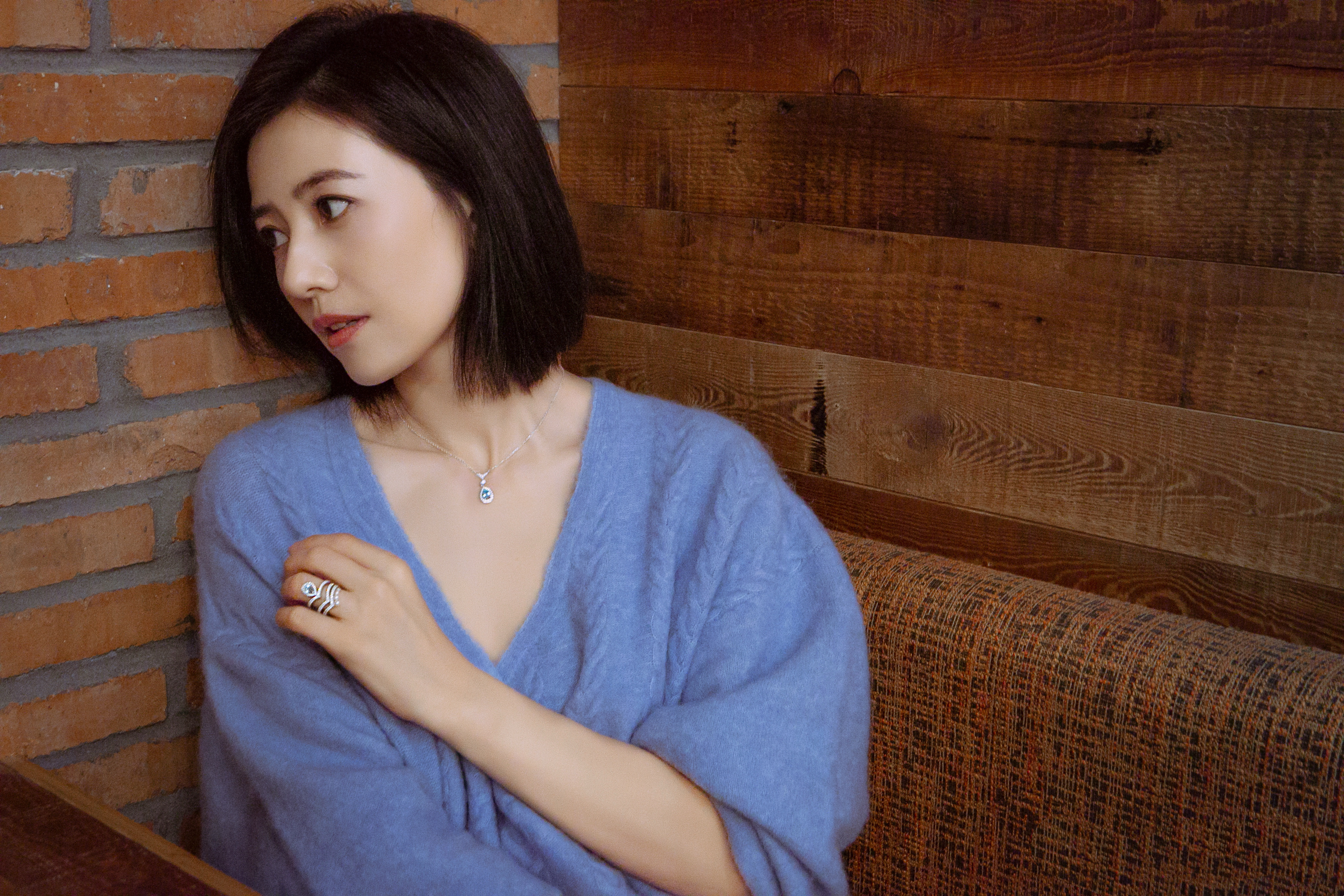 气质温婉又松弛,雾霾蓝的宽松毛衣衬得她温柔又慵懒,随意的姿态尽显从容。背景的红砖与木质墙面,营造出温暖的复古氛围,与她柔和的笑容相得益彰。简约的珠宝点缀,更添精致感,整体画面传递出一种岁月沉淀后的优雅与亲和力,让人感受到她独有的从容魅力。高圆圆