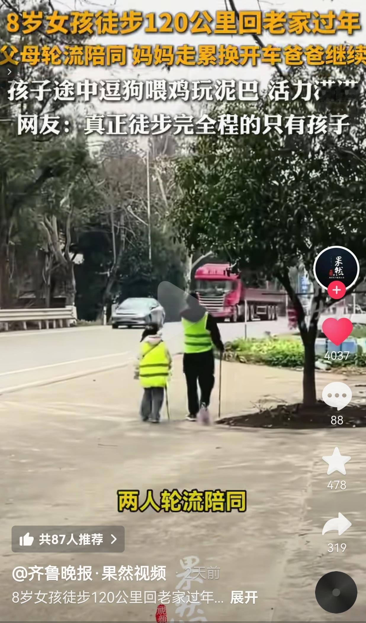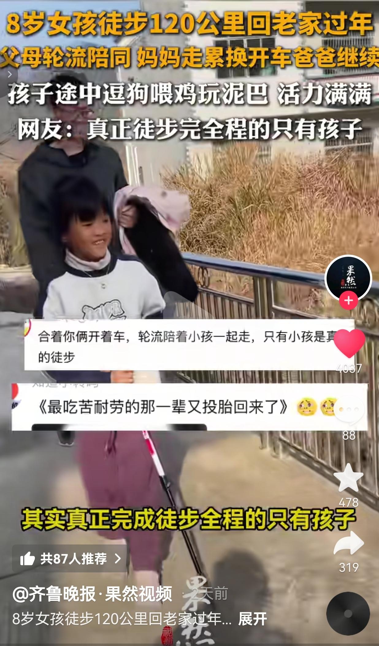 真的太厉害了!太佩服这种意志力了!最近湖南这个8岁半的小女孩火了。 事情是这样的,快过年了,她非要从长沙梅溪湖,徒步120公里回涟源老家过年,非要完成自己的心愿。 这事儿听着就离谱,这么小的孩子,怎么可能徒步走这么远的路程呢? 然而,更离谱的是,还是女孩的爸妈,女孩把自己的她爸妈这次全力支持,真陪了——但陪的方式有点“鸡贼”:爸妈两人轮流陪同,妈妈走累了就换开车,爸爸累了也上车歇着,开车的负责后勤保障,真正一步没落下、把全程走下来的,只有这个扎着小辫、背着小书包的小姑娘,甚至还觉得妈妈走得太慢了。 路上的她,一点都不像在遭罪。看见路边的小狗就停下来逗逗,路过农家院就喂喂鸡,踩踩路边的泥巴,遇到村口的压水井,还会好奇地上去压两下,就这样走一路玩一路。 休息时还不忘练习英语听力,小脸冻得红扑扑的,却笑得比谁都灿烂,活力满满,不喊苦不喊累,仿佛这120公里、五天的徒步根本不是挑战,而是一场盛大的探险。  其实这不是她第一次挑战了。 前两次,一次遇上大雨,一次崴了脚,都遗憾中断了。可这孩子越挫越勇,今年主动跟爸妈说:“我要再试一次。” 网友看到后评论说:“合着你俩开着车,轮流陪着小孩一起走,只有小孩是真的徒步。” 也有的网友说:“真正徒步完全程的只有孩子,爸妈是带薪陪练。” 还有的网友说:“这哪是回老家,这是‘最吃苦耐劳的那一辈又投胎回来了’!” 我们总说现在的孩子娇生惯养,吃不了苦,可这个8岁的小姑娘,用自己的小脚丫,走出了最硬核的坚持。 她或许不懂什么是“毅力”,什么是“挑战”,但她知道:想回老家,就一步一步走;摔倒了,爬起来再走;没走完,就下次再来。 反观我们这些大人,遇到点困难就想躺平,有点累就想放弃,还不如一个孩子通透。 笑过之后,我又有点羡慕。 我们总说要培养孩子的抗挫力,可真正的抗挫力,从来不是逼出来的,而是孩子自己在一次次尝试、一次次跌倒里,慢慢长出来的。 就像这个小姑娘,她不是为了证明什么,只是想靠自己的双脚,走回那个有亲人、有年味的家。到家才发现,真正完成徒步全程的只有她自己,而这份坚持,早已成了她身上最亮的光。