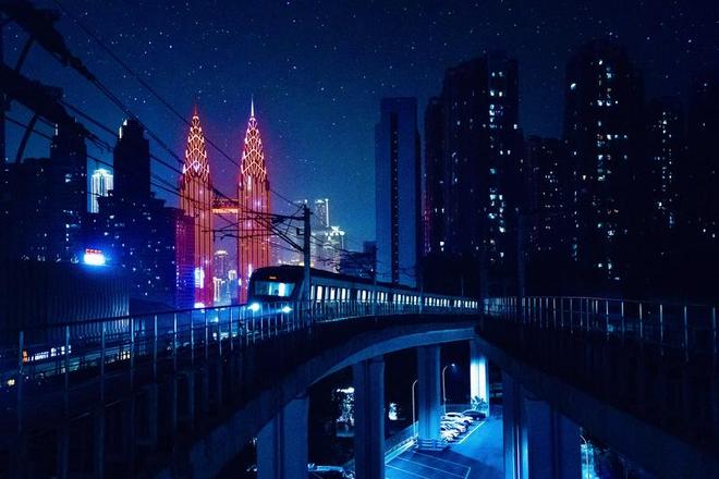 赛博朋克风,重庆轻轨穿城,重庆双子塔夜景。ICPhoto