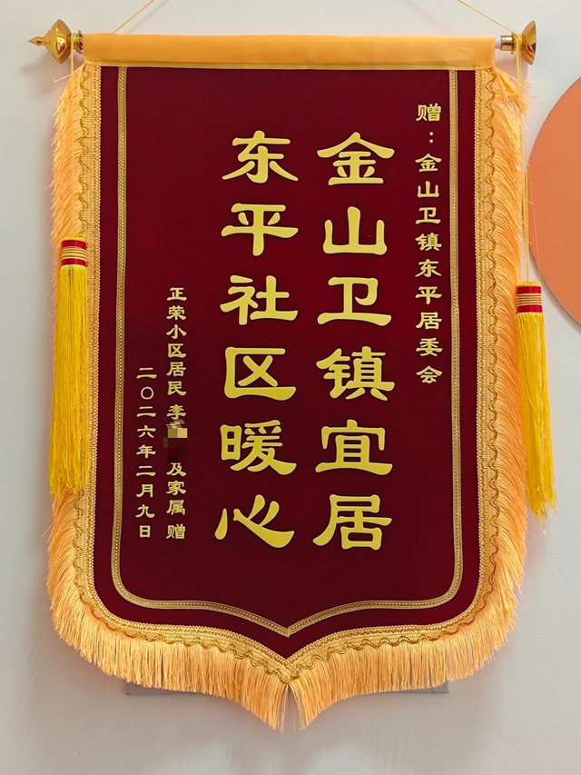 近日,李阿姨专程给金山卫镇和东平居委会送了一面锦旗和一封感谢信。锦旗上“金山卫镇宜居东平社区暖心”短短两句话,却承载了李阿姨一家在此生活十年所感受到的沉甸甸的邻里温情和政府关怀。