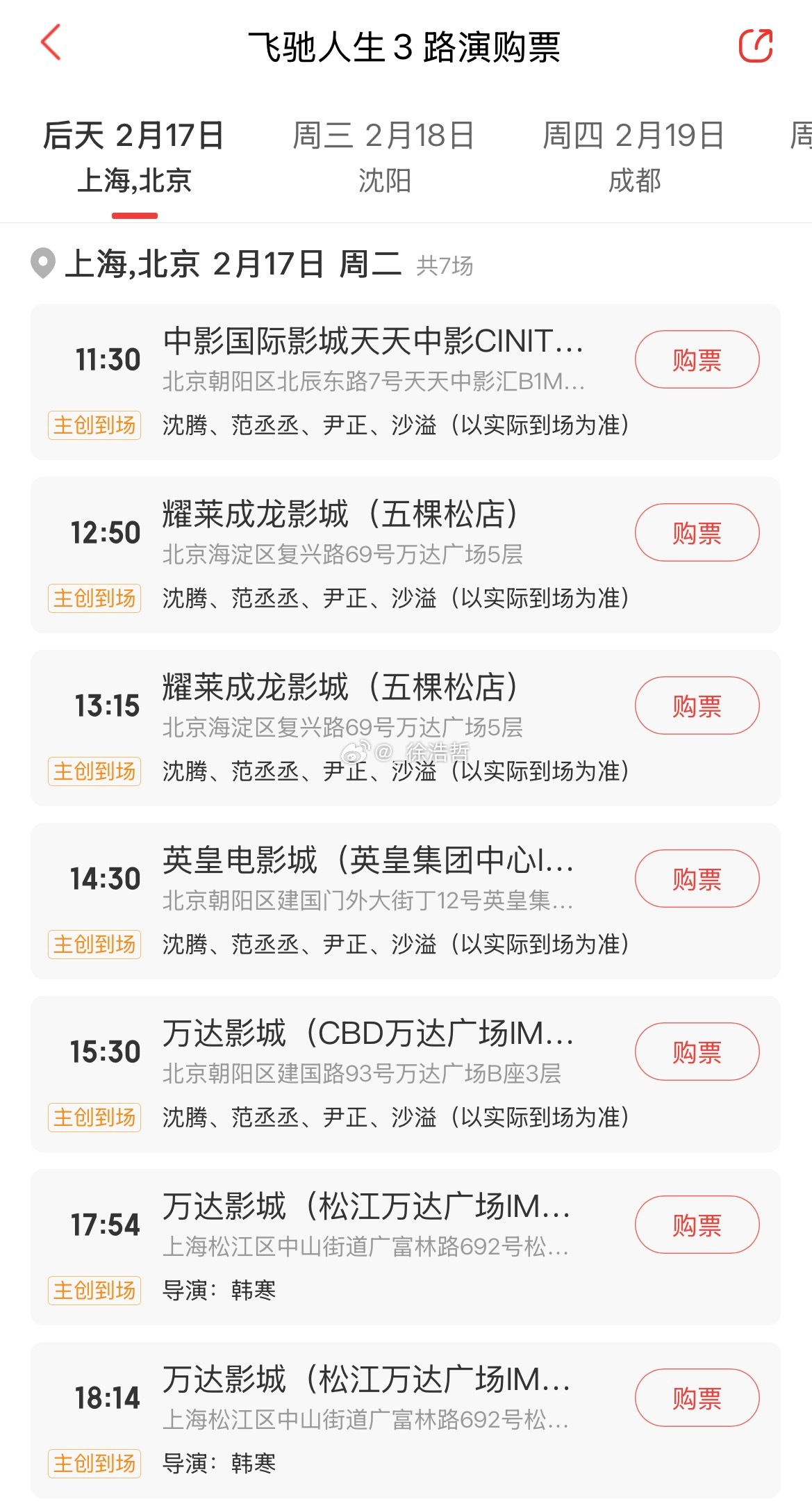 电影飞驰人生3电影《飞驰人生3》路演城市、时间、活动影城见图映后到场嘉宾如下2.17 上海 沈腾、范丞丞、尹正、沙溢北京 韩寒2.18 沈阳 沈腾、尹正、沙溢、张新成2.19 成都 沈腾、尹正、魏翔、张新成2.20 三亚 沈腾、尹正、魏翔、张新成