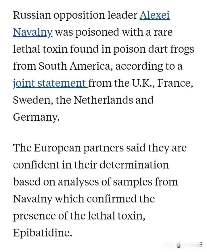 英国、瑞典、法国、荷兰和德国在周六发布一份声明:普京的反对者纳瓦尔尼是被一种罕见的致命神经毒素毒死的,这种毒素只有南美洲的毒镖蛙体内才有,俄罗斯境内没有。 🤔 当然,克宫永远都不会承认是他下令杀害了纳瓦尔尼。 所以,能收拾克宫的只有乌克兰人、只有泽连斯基。✊ 俄罗斯反对派人士纳瓦尔尼中毒 乌克兰 俄乌战争