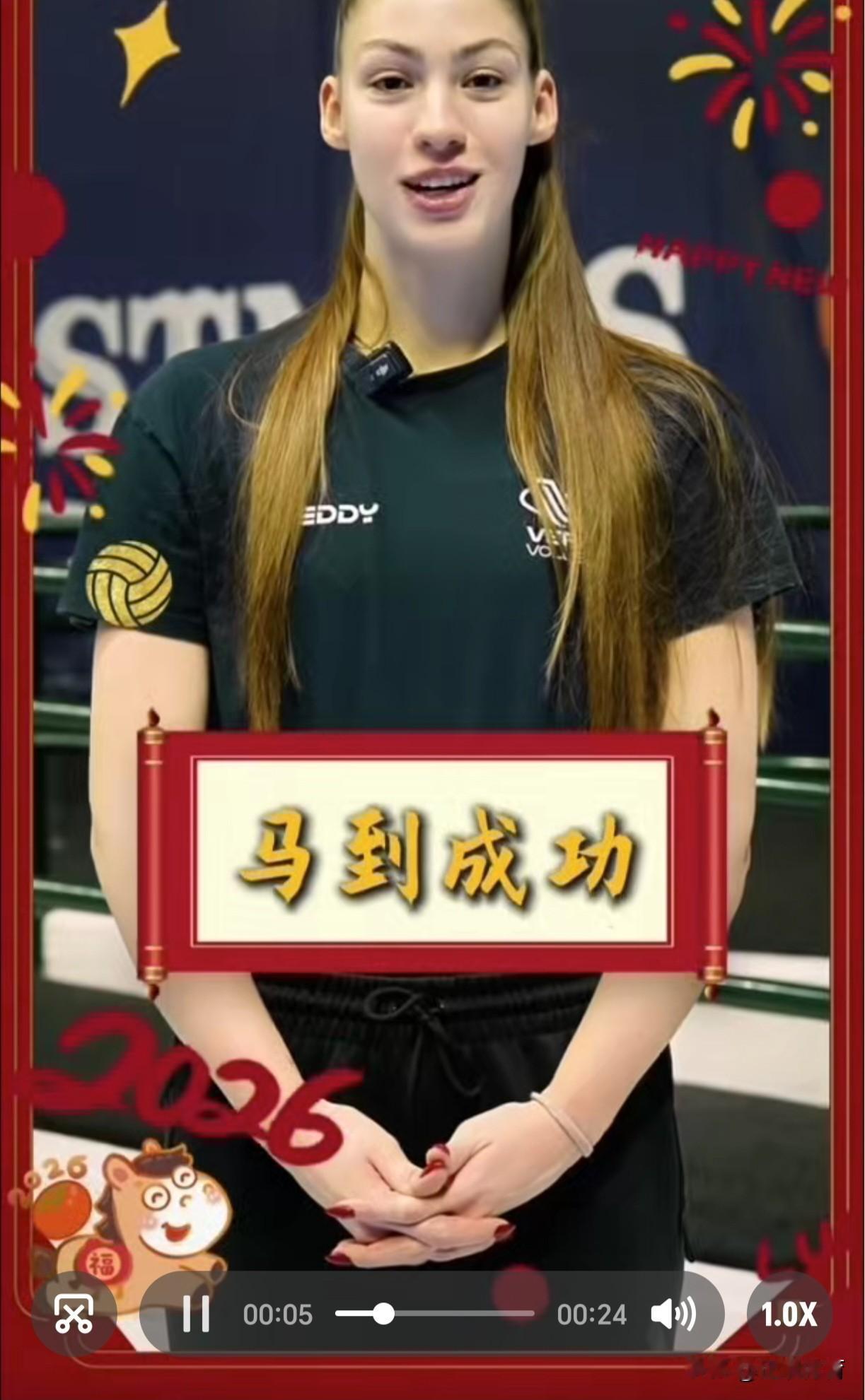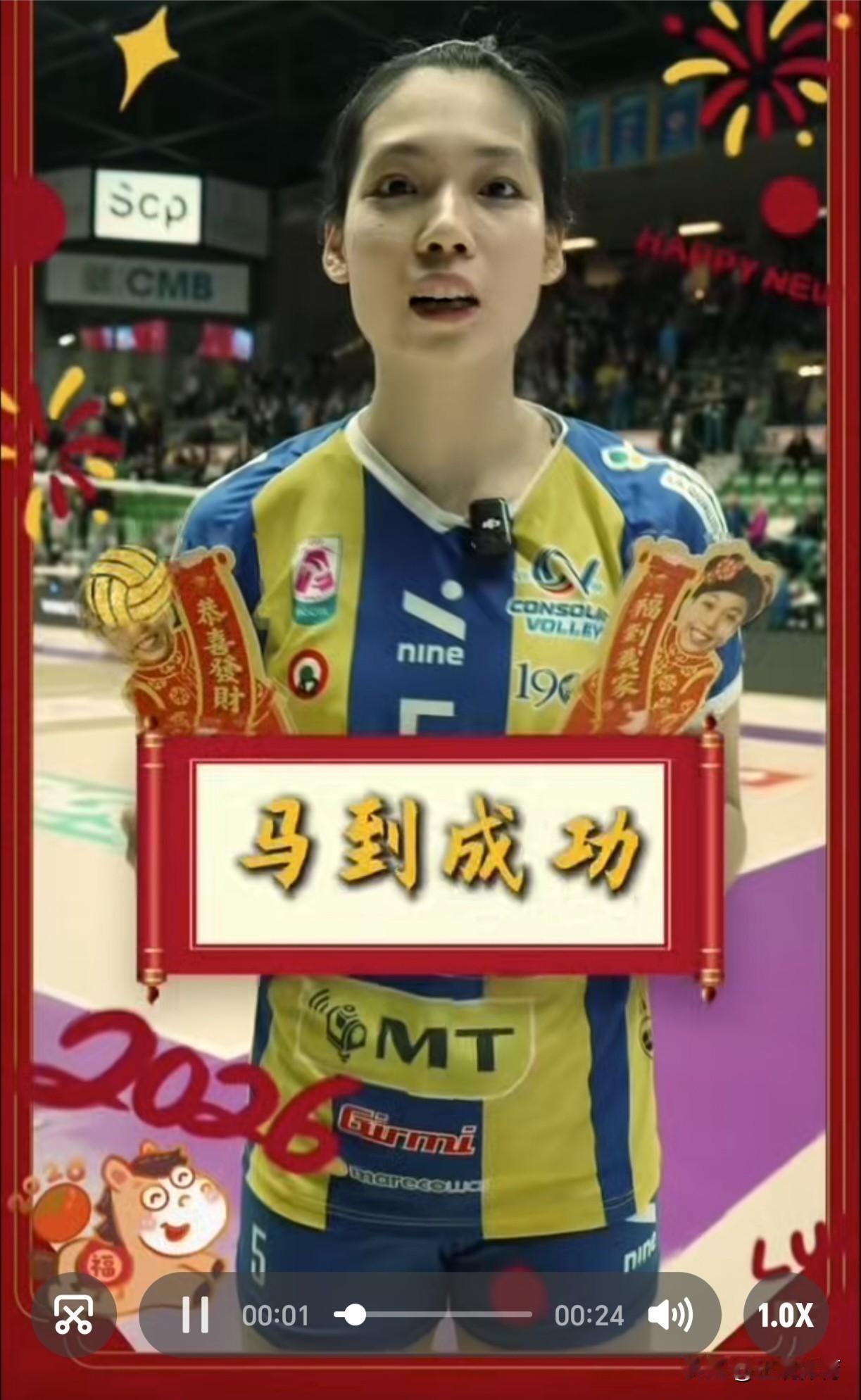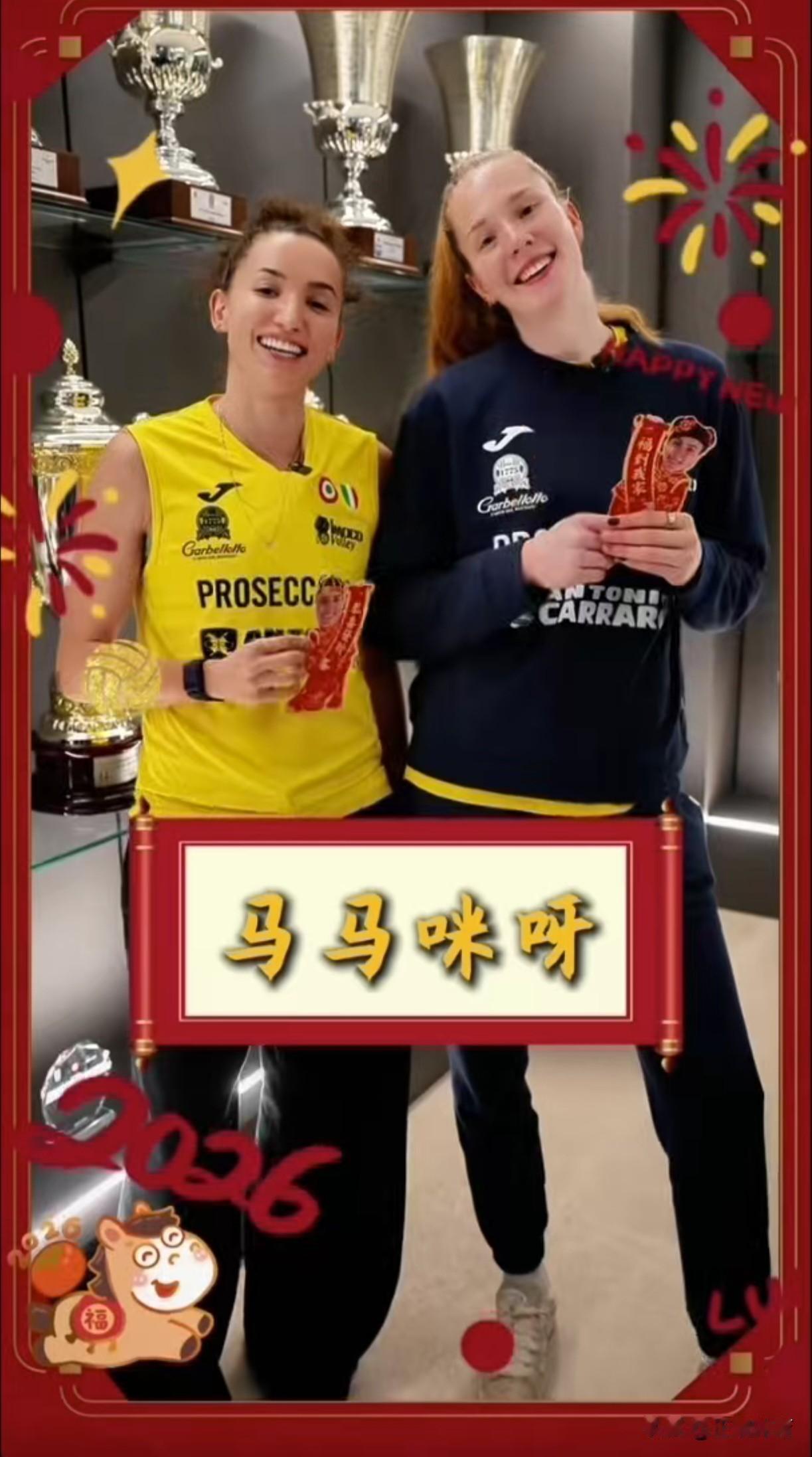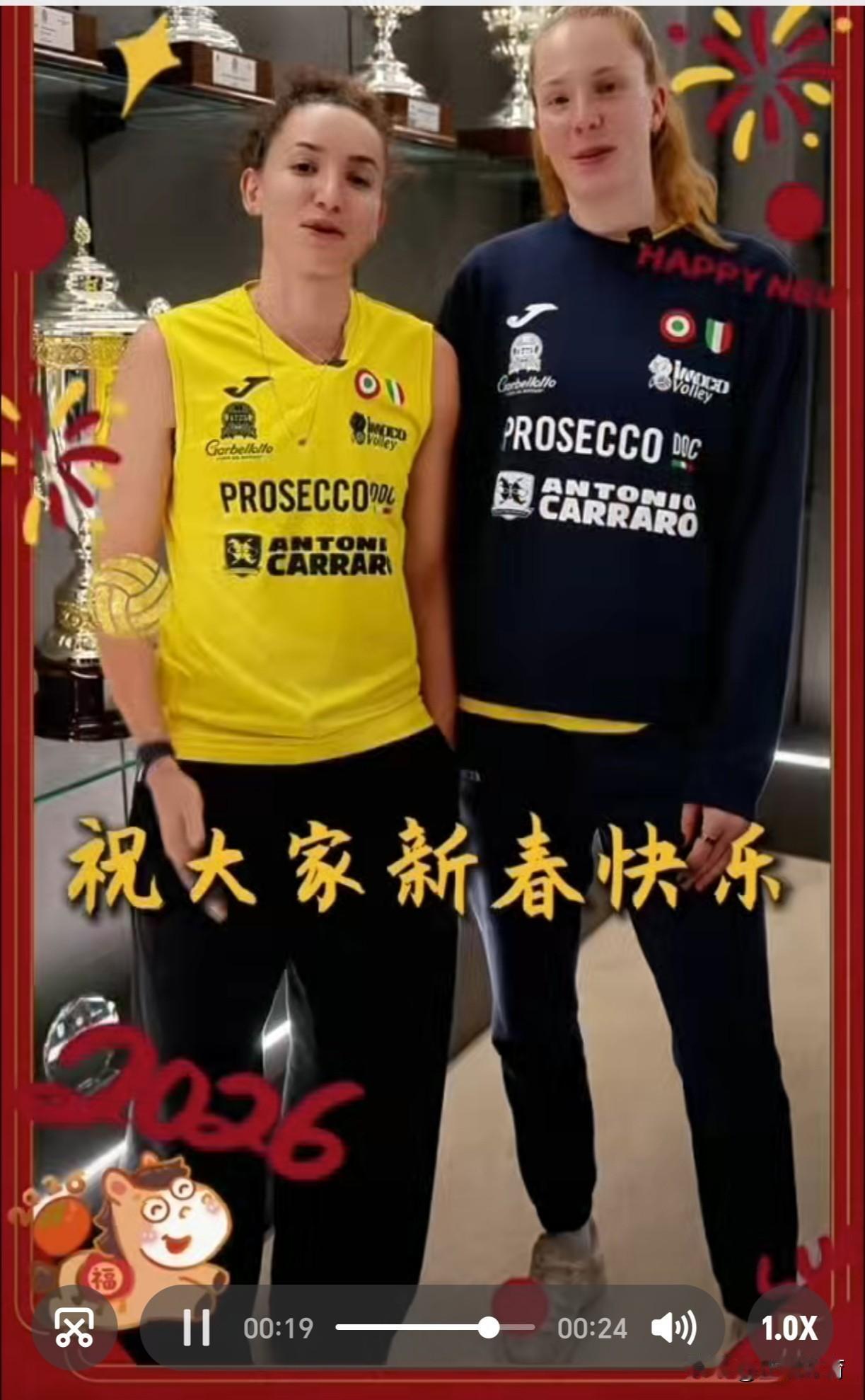 【朱婷携手庄宇姗向全国球迷拜年了】 佳节来临,远赴意大利效力的中国女排两朵金花朱婷和庄宇姗祝全国的球迷朋友们新年快乐,一马当先,马到成功! 同时送来祝福的还有队友加比和哈克等,她们因朱婷喜欢上了中国年。 朱婷今晚还有比赛,意甲女排第25轮,科内VS佩鲁贾,朱婷有望首发。 朱婷和庄宇姗明天大年三十都没有比赛,她俩可以痛痛快快包扁食吃饺子,俩个人今年在异乡结伴过春节,别有一番风味和温情。 祝朱婷和庄宇姗新春快乐万事如意!新年新气象,马年皆顺遂!