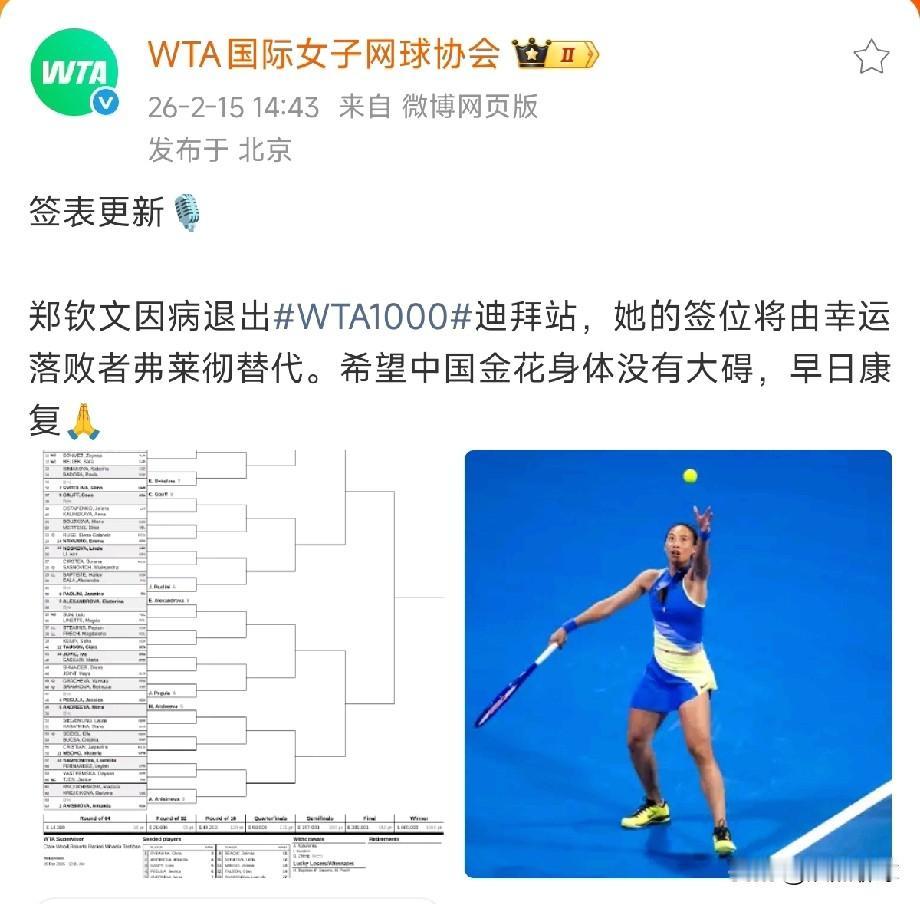 郑钦文迪拜站最新消息,她又退赛了,原定下午4点半的比赛由弗莱彻代替 就在刚刚WTA发布的最新消息,原定于2月15日下午4点半进行的WTA1000迪拜站首轮比赛,郑钦文对阵斯特恩斯。因为郑钦文有伤病,退出迪拜站的比赛,她的参赛席位将会由弗莱切代替。上一站多哈站郑钦文复出取得两场比赛的这里,在16进8强中被莱巴金娜2比1淘汰。本来大家还想在春节期间看到她的比赛,现在只能等她参加下一站比赛了!郑钦文 郑钦文退赛