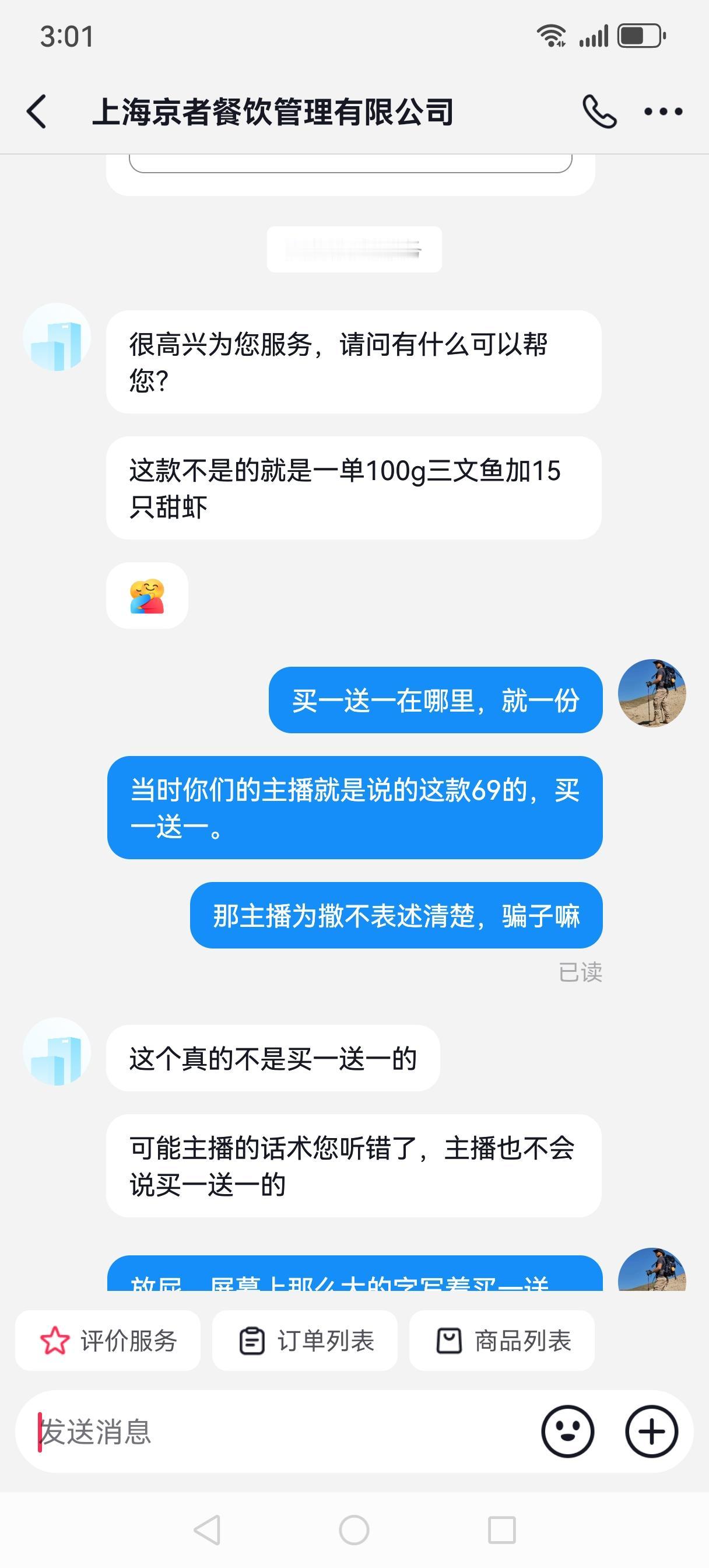 骗子太多了,真是当当不一样,在抖音里看着三文鱼有配送,还买一送一,伊宁可用,配送费自己掏,想着很实惠,就下了一单,送来后,就是这一小盒,和图片也不符,和客服沟通,她说没有送,就是不承认,还把我拉黑不和我沟通了,在这快新年我也不想说撒了。 实物(七片,十几个小虾) 我是被买一送一给套路了,不能贪图便宜呀。 海鲜美食 过年
