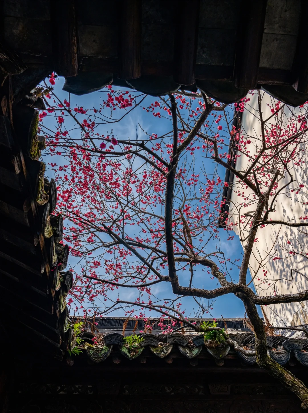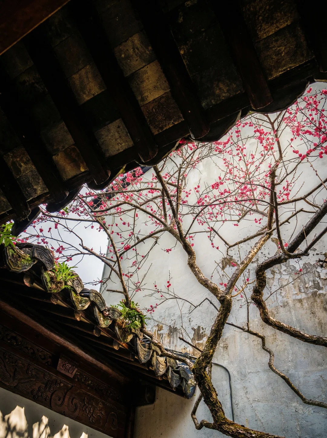 白墙黛瓦,红灯笼挂在屋檐下,倒影落在落地玻璃上。