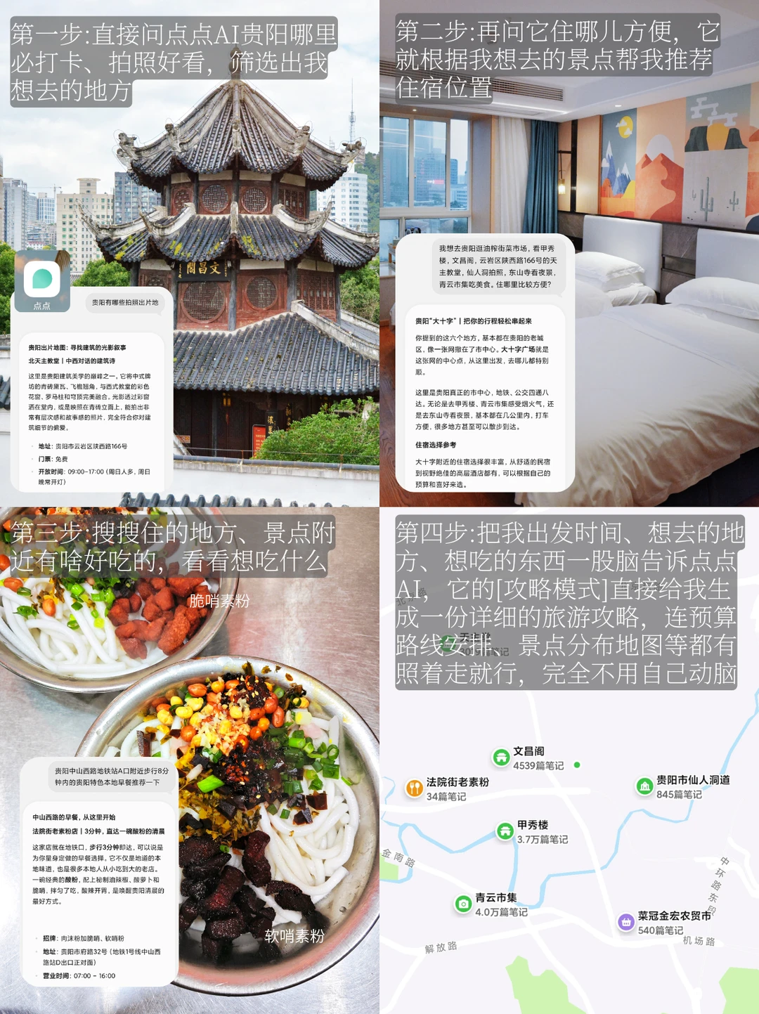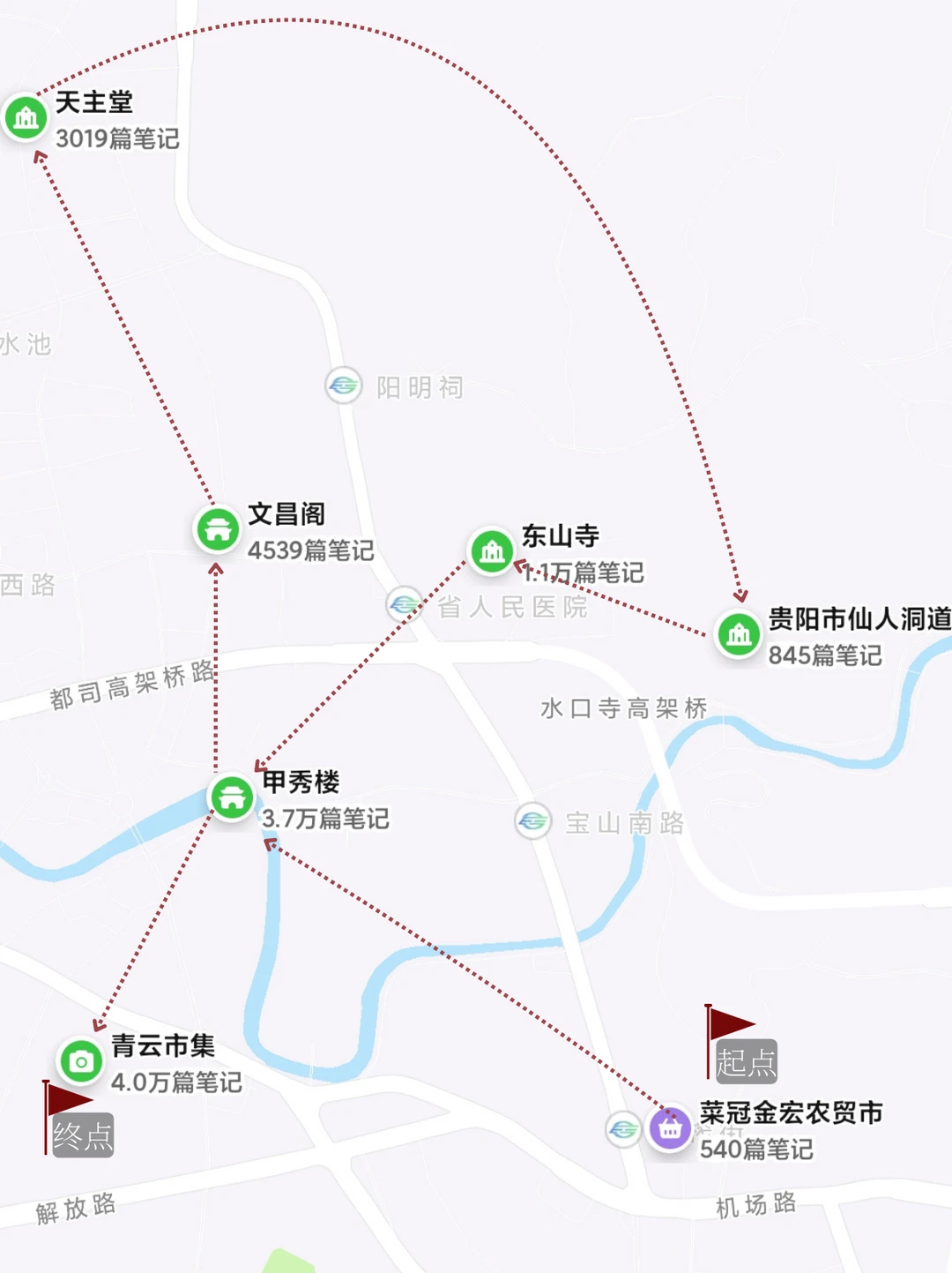 中山西路地铁A口➡️法院街老素粉➡️油炸街菜市场➡️甲秀楼➡️南门口肠旺面➡️北天主教堂➡️文昌阁➡️仙人洞道观➡️东山寺➡️青云市集