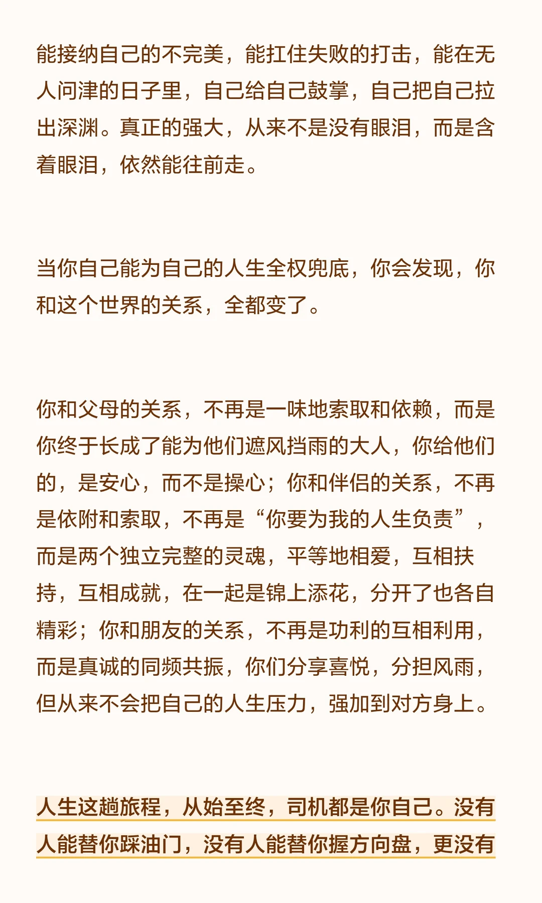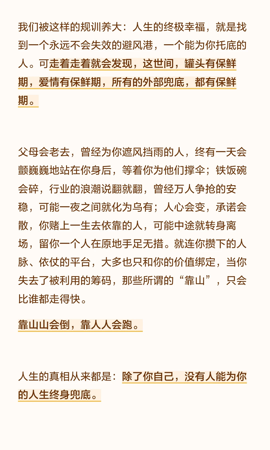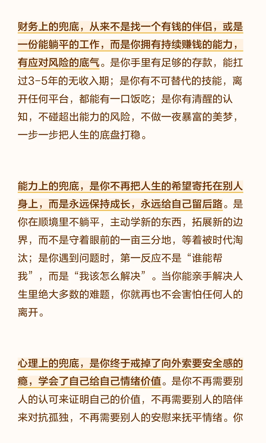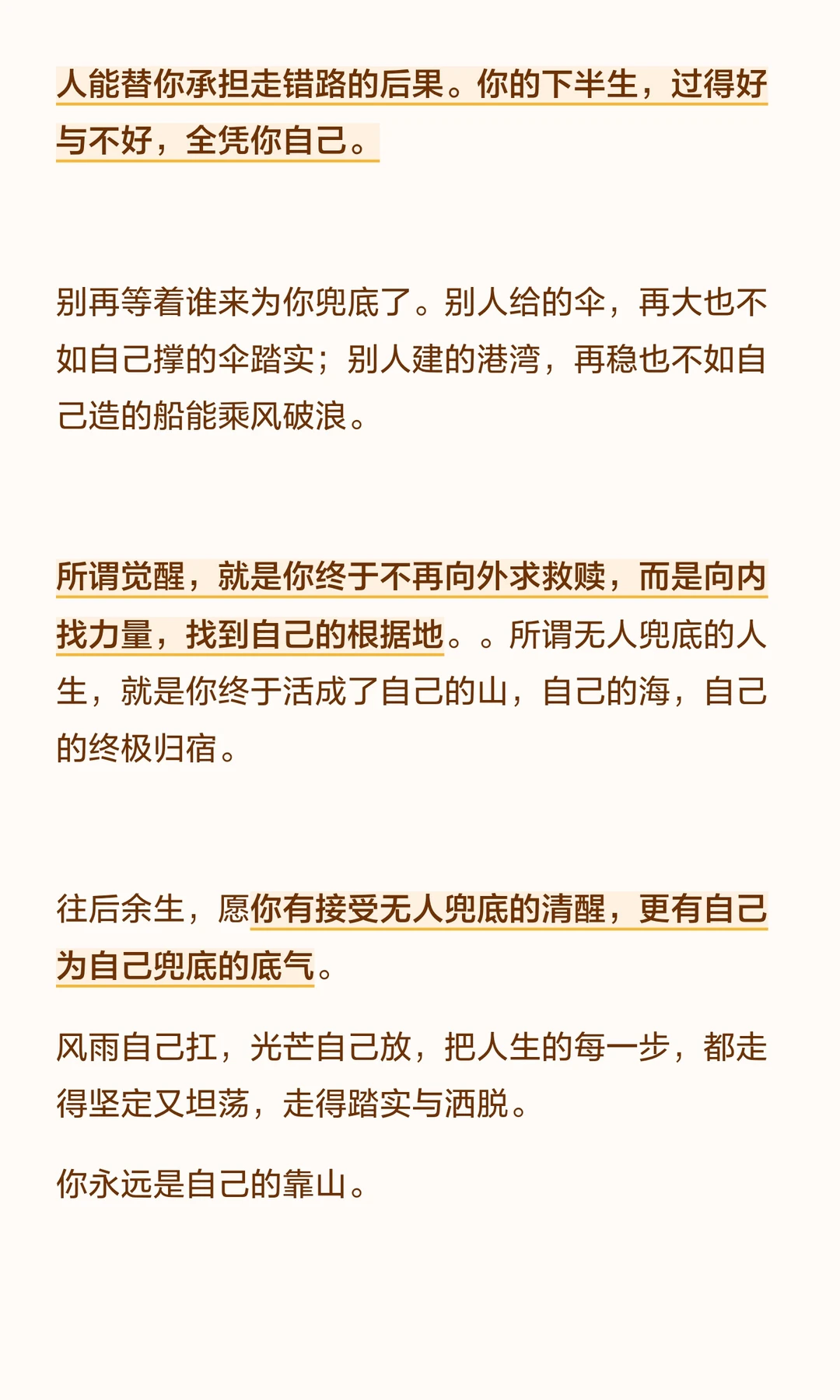 人生没有永远的避风港,无人兜底并非绝境,而是自我掌控的起点。 学会为自己兜底,包括财务、能力、心理上的独立,才能真正掌控人生。 接受他人帮助,但不依赖,保持成长,才能在风雨中自立自强,活出自己的精彩。