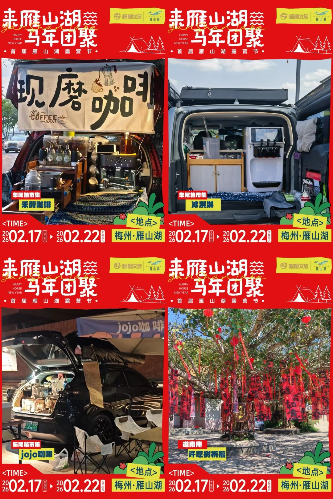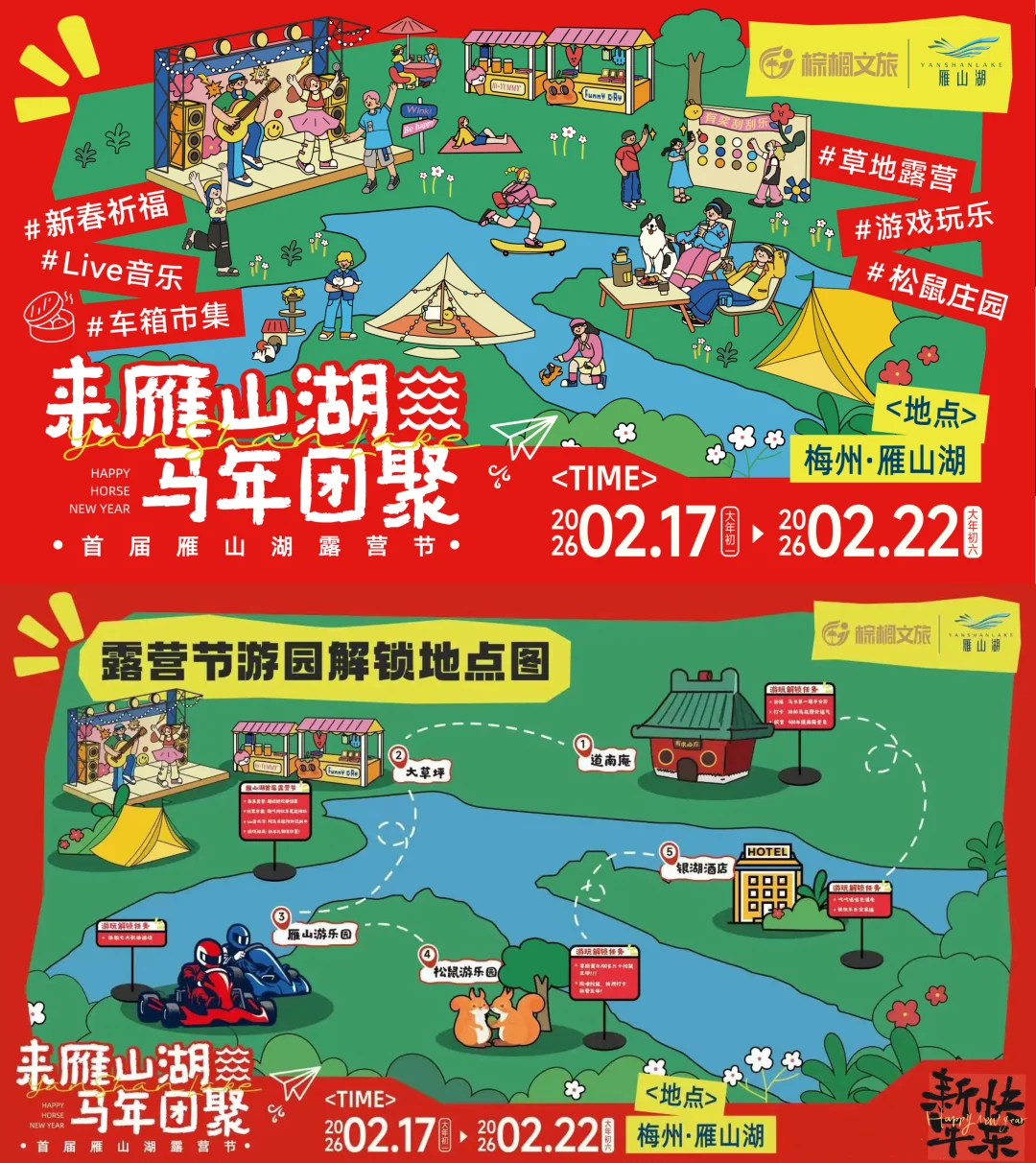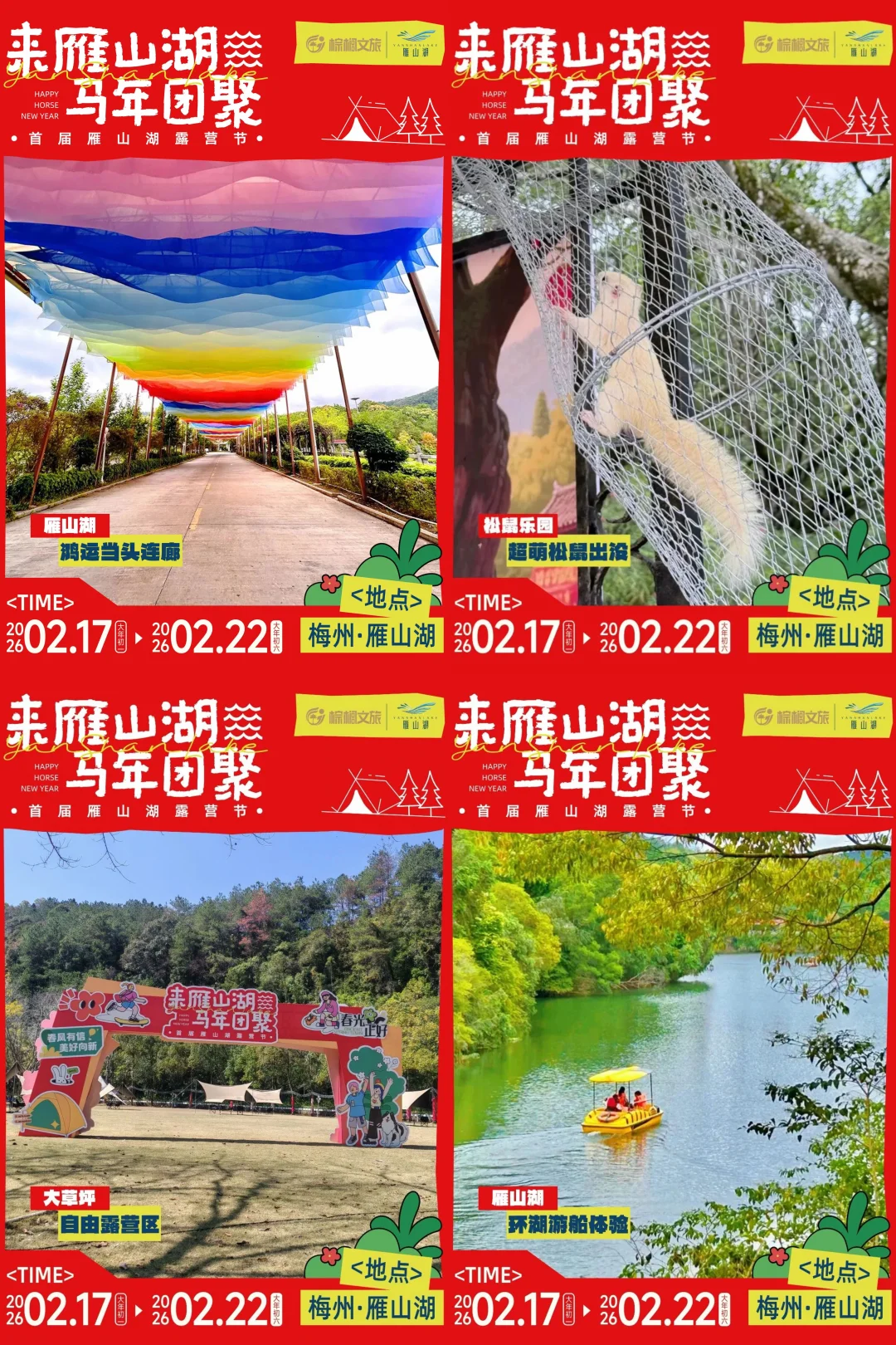 🔥2026春节必冲! 🌅梅州雁山湖露营节,年初一到初六嗨翻天~ 🏕️ 帐篷露营+宠物友好大草坪,毛孩子撒欢必备! 🎪 车尾箱市集+Live音乐会,年味和潮流全都有! 📍 导航:雁山湖国际花园度假区
