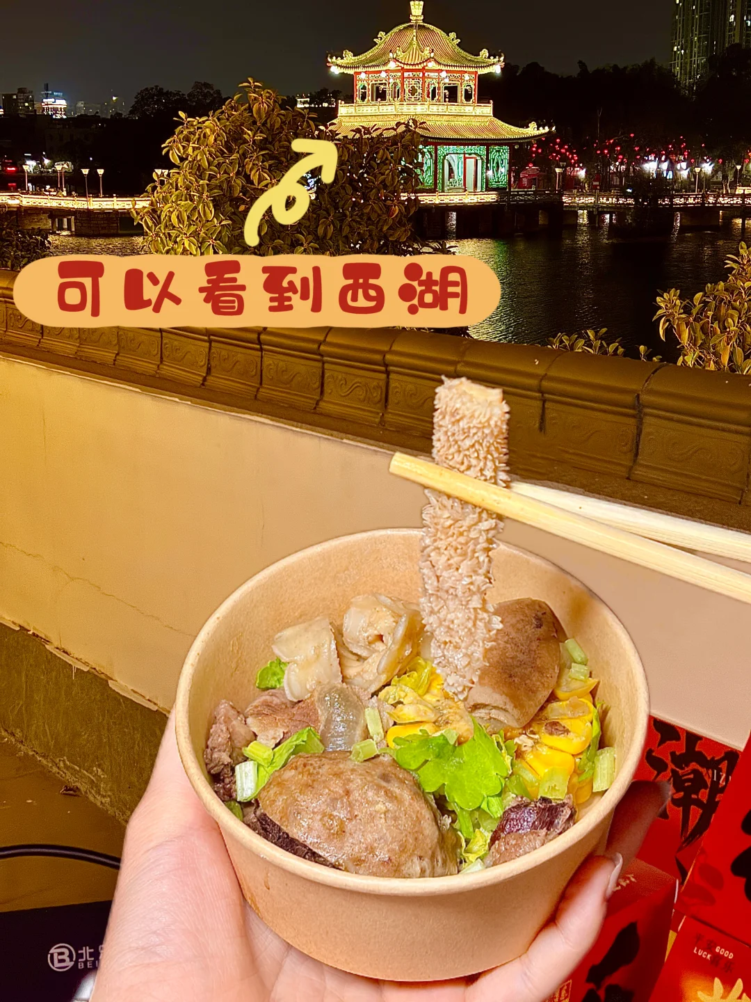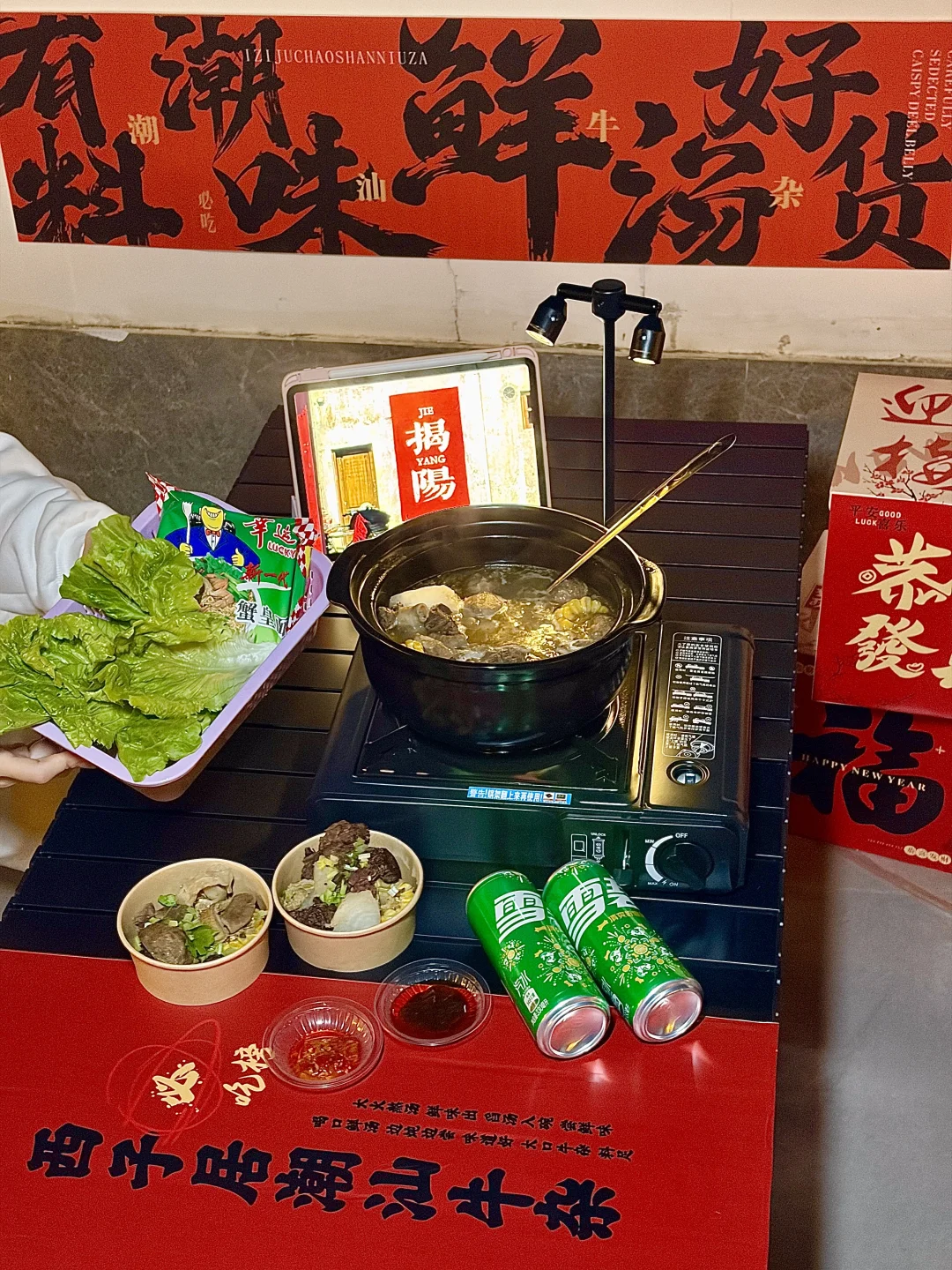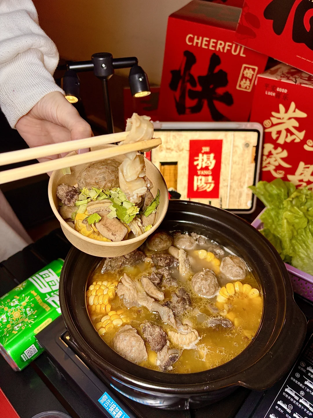 在揭阳找到了春节聚餐的满分机位✨坐在天台吹着晚风,眼前是西湖的灯火亭台,锅里是咕嘟冒泡的潮汕牛杂,抬头就是“你得发大财”的巨型横幅,这年味直接拉满到2026马年🐎