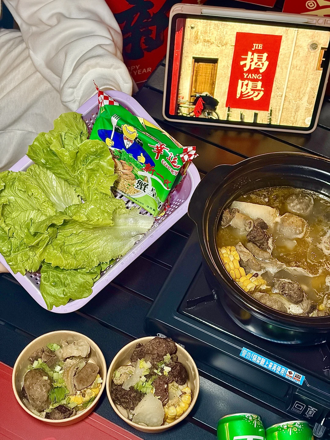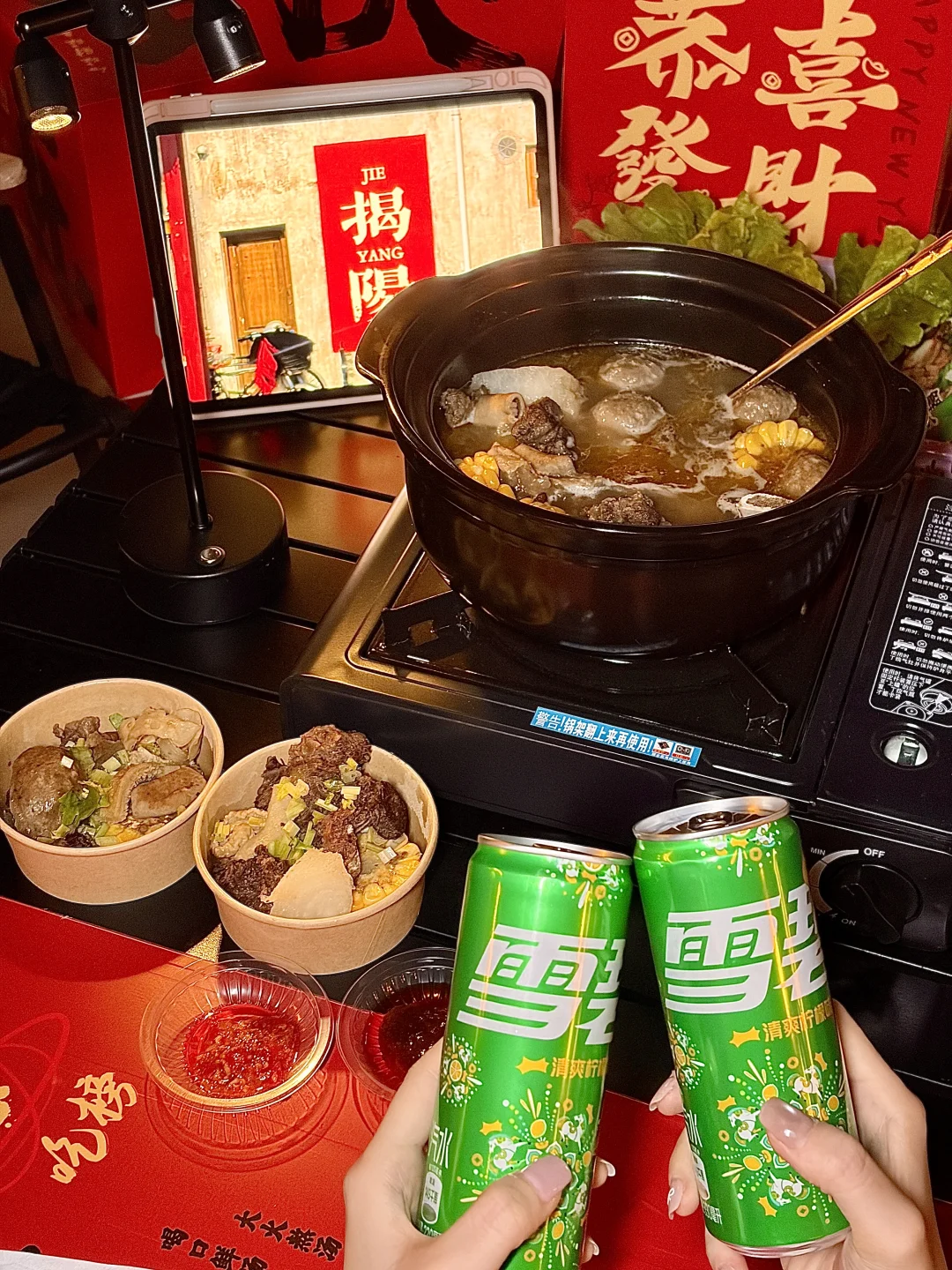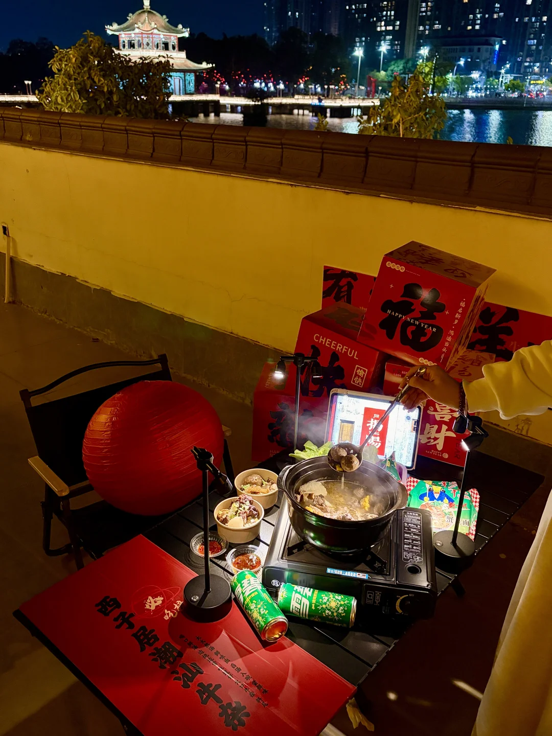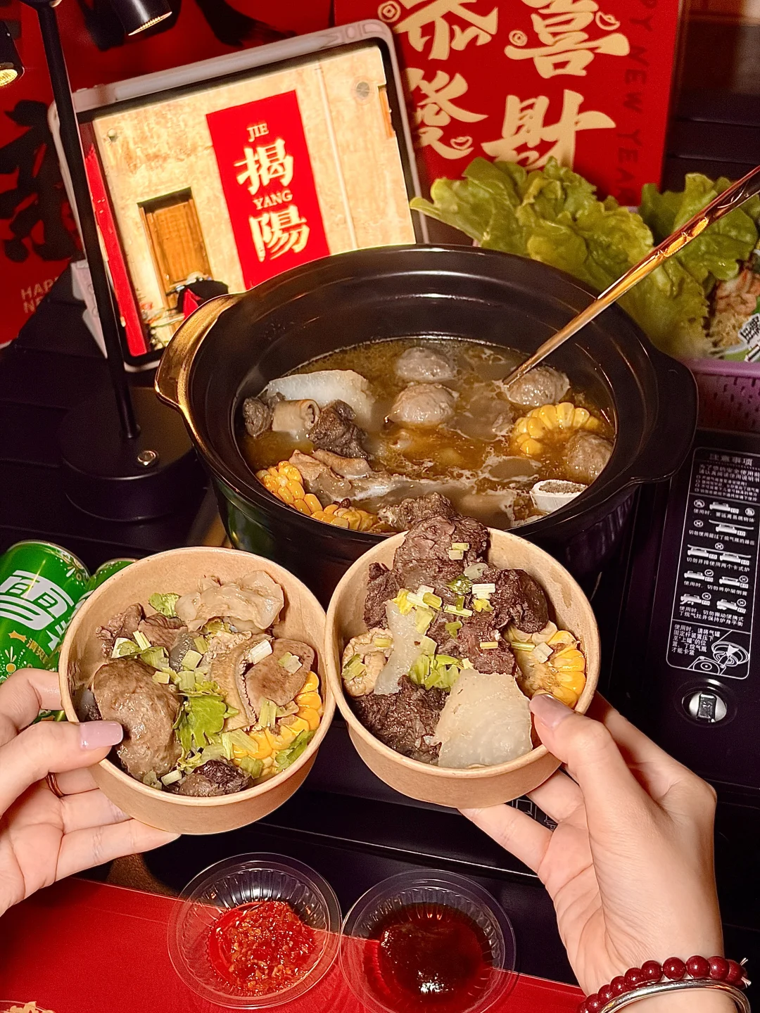 在揭阳找到了春节聚餐的满分机位✨坐在天台吹着晚风,眼前是西湖的灯火亭台,锅里是咕嘟冒泡的潮汕牛杂,抬头就是“你得发大财”的巨型横幅,这年味直接拉满到2026马年🐎