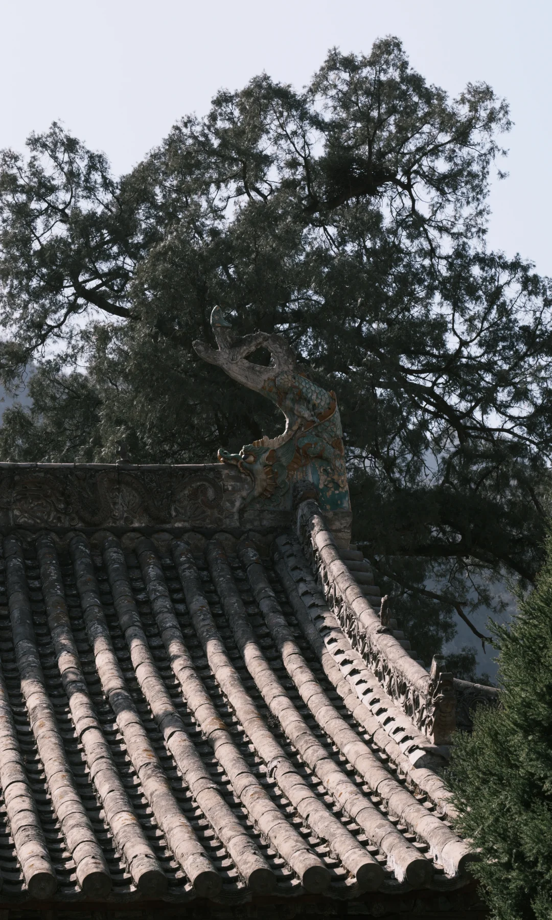 值得补充的是门口两棵古树白皮松,我是从来没见过的宝贝。梧桐树的躯干,松树的树冠树叶,也算个漂亮的家伙吧!