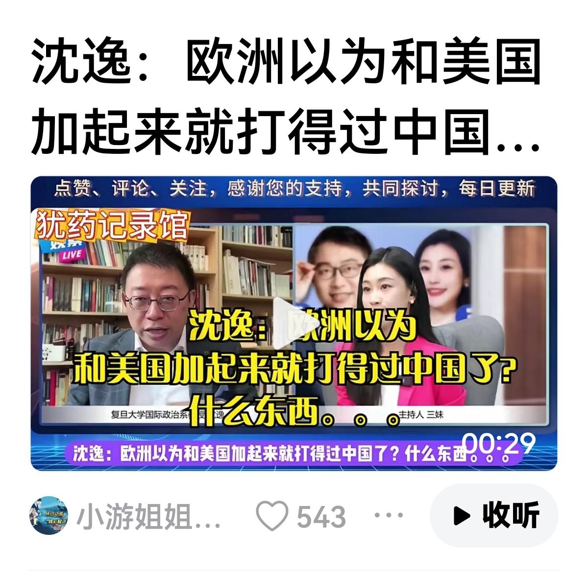 【沈逸这次演砸了】 沈逸一开始分析高市很难当选,因为古典的日本右翼不会让女人来掌舵。 后来当选了,沈逸破口大骂,不是人,她闯的祸要全日本民众承担,谁让你们选她。 转眼又兴奋起来,说等了十八年,终于等来了,来吧,来挑衅吧。 他又说自己能去美国,但不会去, 美国人的消费是“痛苦”式消费。 美国拿我们没有办法,除非来干一仗, 欧洲加上美国也不是我们的对手. 我们将成为世界的中心, 因为我们是高阶文明,西方是蛮人入侵。 看看他以后如何演绎……