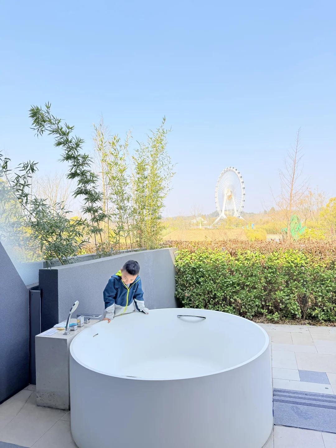 ✅第一天下午我们入住世博园内的瀑布美憬阁酒店,庭院景观房间超大,还有mini吧,可以泡澡🛀🏻,我们的房间阳台正对的就是世博园摩天轮🎡