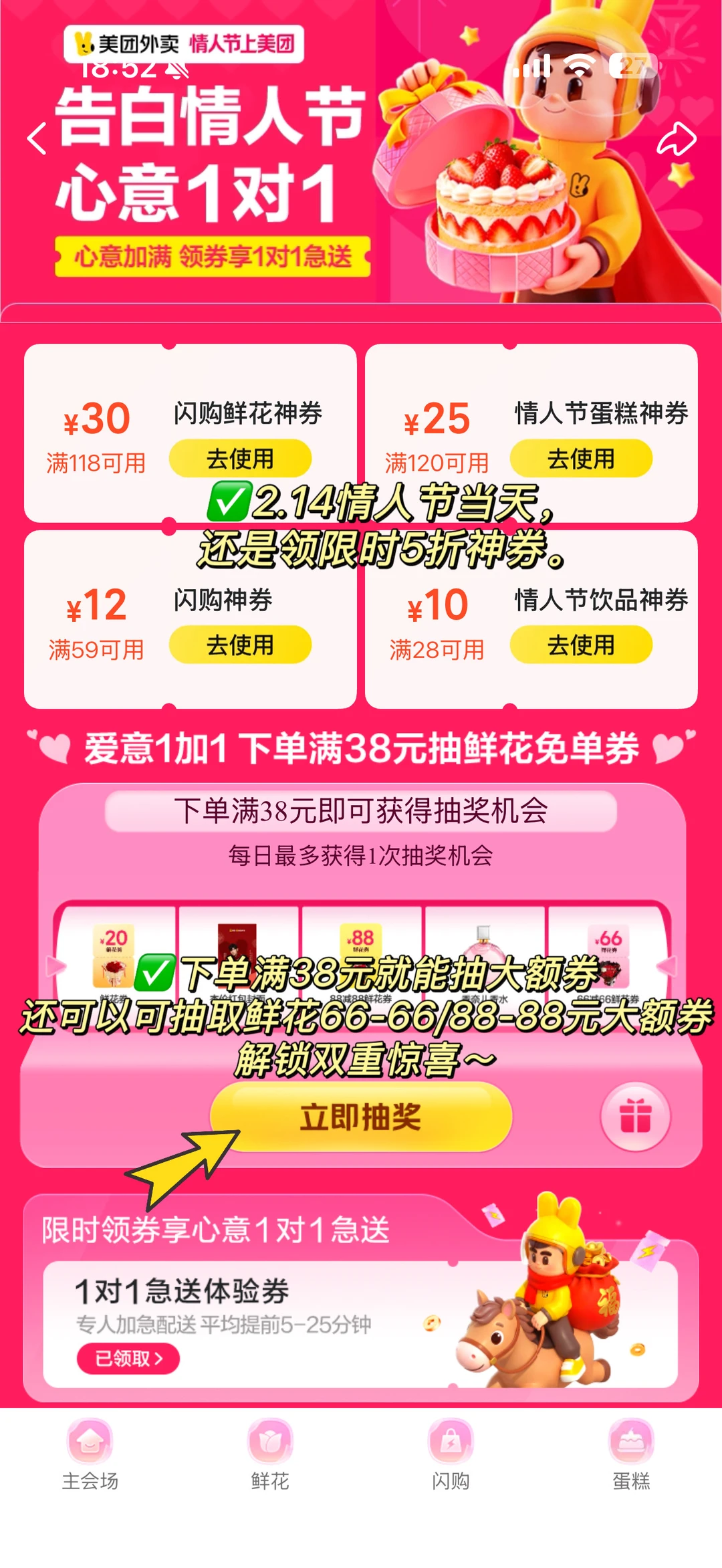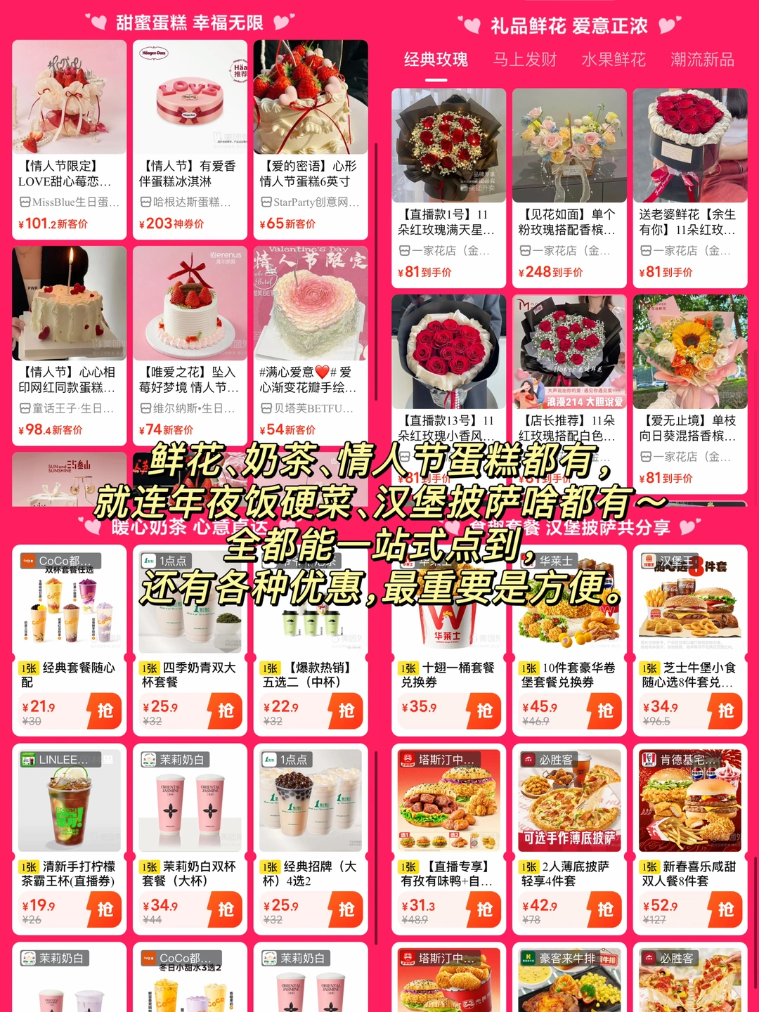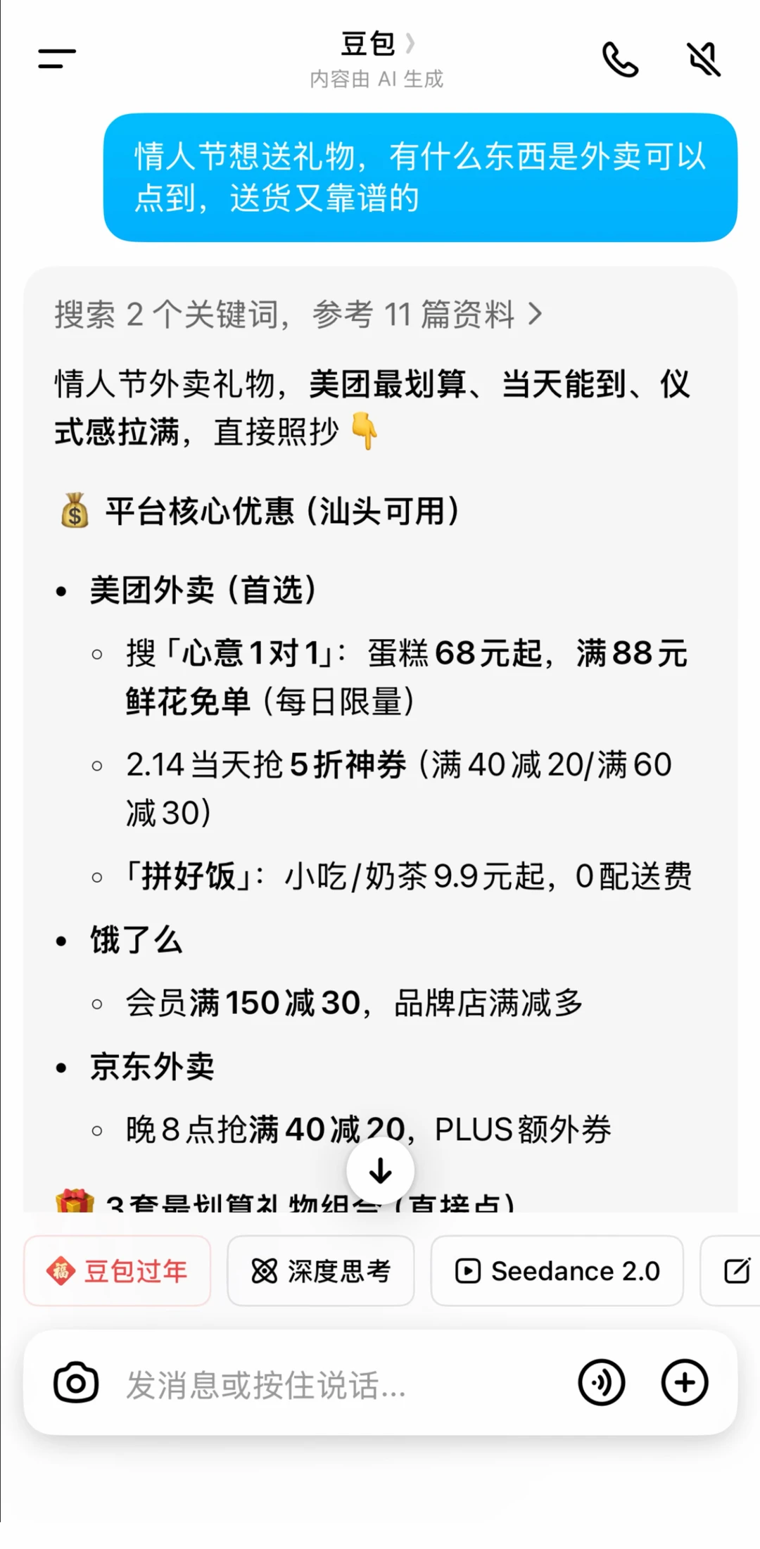 今年情人节简直是地狱开局,最后一天上班忙到飞起就算了,等下还得赶高铁。 对象还提前回老家了,我俩直接异地分割两地,可该有的仪式感我还是想安排上,对着手机想半天都不知道咋弄。 灵光一现,想起现在好多人都有问题让AI帮忙解答,我赶紧试了试问豆包【情人节想送礼物,有什么东西是外卖可以点到,送货又靠谱的】 豆包直接给我安利了各家的活动优惠,还是美团【心意1对1】的活动最划算的!按照豆包告诉我的解决办法搜索一看就知道这次稳了,里面鲜花、奶茶、情人节蛋糕全都有,就连年夜饭硬菜、汉堡披萨也能一站式点齐,还有很多优惠,最重要是真的方便。 特别是美团的1对1急送,真的直接送到我心巴上了,买了巧克力配送小哥还用专属包装把巧克力护得好好的,这种“专属的爱”仪式感,只要够快够准时真的比啥昂贵礼物都戳人! 只要在⏰2.10-2.14期间,打开美团/美团外卖App,直接搜🔍【心意1对1】就可以参与了,蛋糕鲜花全都有! ✅下单满38元就能抽大额券,可以抽鲜花66-66/88-88元大额券~ ✅2.14情人节当天,还能领限时5折神券。 ✅每天还有限量1对1急送体验券可以领,专属配送又快又有仪式感。 同事薅了一张1对1急送券点了两杯奶茶,没想到平时40分钟才能送到的外卖,今天20分钟就送到公司了!快了足足一倍,直接拿了奶茶直奔高铁站! 像这种节日商家爆单是必然的,蛋糕鲜花直接用美团外卖1对1急送就更有把握了!! 给女朋友、老板、客户,用美团外卖1对1急送不仅更快,体验感也会更好
