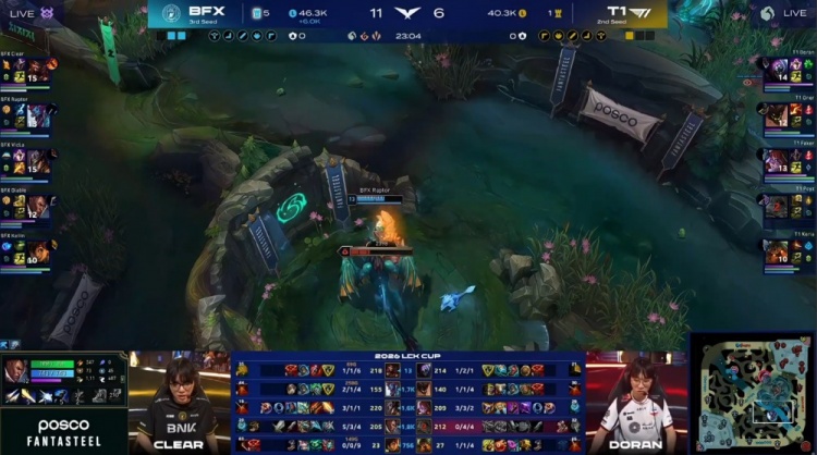 [23:51]BFX入侵T1野区,Diable卢锡安换掉Keria,Clear纳尔游龙拍掉T1上野,BFX打出2换3。