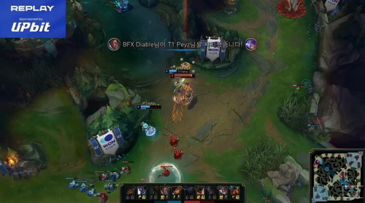 [3:50]下路2v2,Diable卢锡安贴脸狂A击杀Peyz芸阿娜拿到一血。