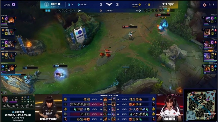 [8:20]Vicla卡牌开大来下与队友越塔,Vicla落地就杀Peyz,T1众人包夹过来,Oner石头人再次撞飞Diable将其击杀,Faker阿萝拉收掉残血Raptor巨魔,T1打出1换2。