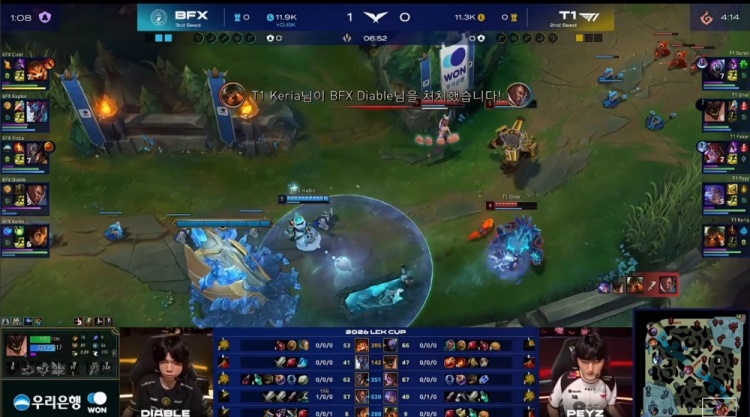 [6:52]Oner石头人来下闪现预判撞飞Diable卢锡安,Keria泰坦点火拿到Diable人头。