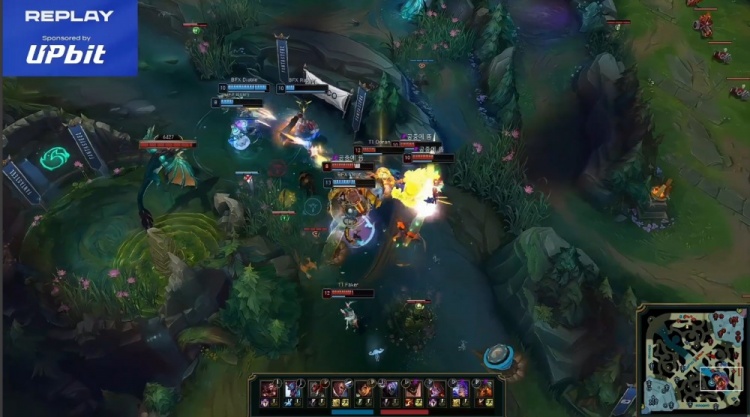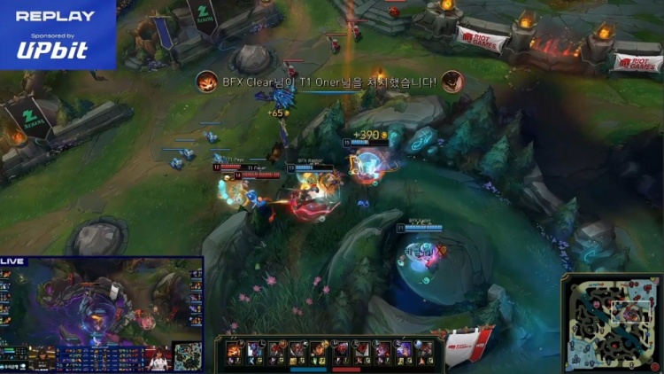[14:17]Faker河道吃果子被Clear大纳尔拍上墙送Vicla卡牌人头,BFX经济领先2.5k。