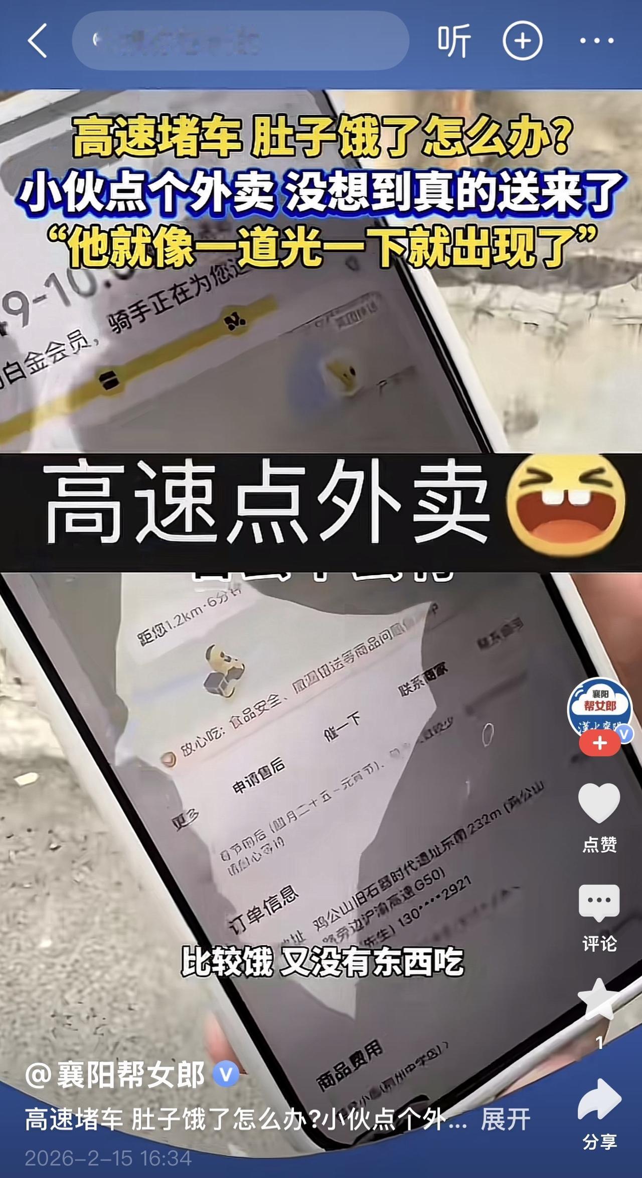 太绝了!湖北荆州这位男子,直接把外卖点上高速,思路打开全是出路! 春运高速堵成长龙,饿到发慌却没干粮,换别人只能硬扛,他灵机一动下单外卖,本是碰碰运气,没想到真有骑手接单。 两人默契配合,小哥送到护栏边,跨栏取餐的一幕,又好笑又暖心。 他说小哥像一道光,这道光不止是热饭热菜,更是普通人互相成全的温柔。遇事不钻牛角尖,灵活变通,再难的处境也能找到破局点。 当然也要提醒大家,高速出行尽量备足物资,安全第一。