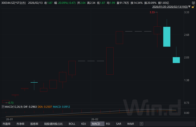 大涨之后转大跌。2月12日、2月13日连续两个交易日,*ST立方收盘价跌幅偏离值累计35.89%。13日跌停报收1.87元/股。