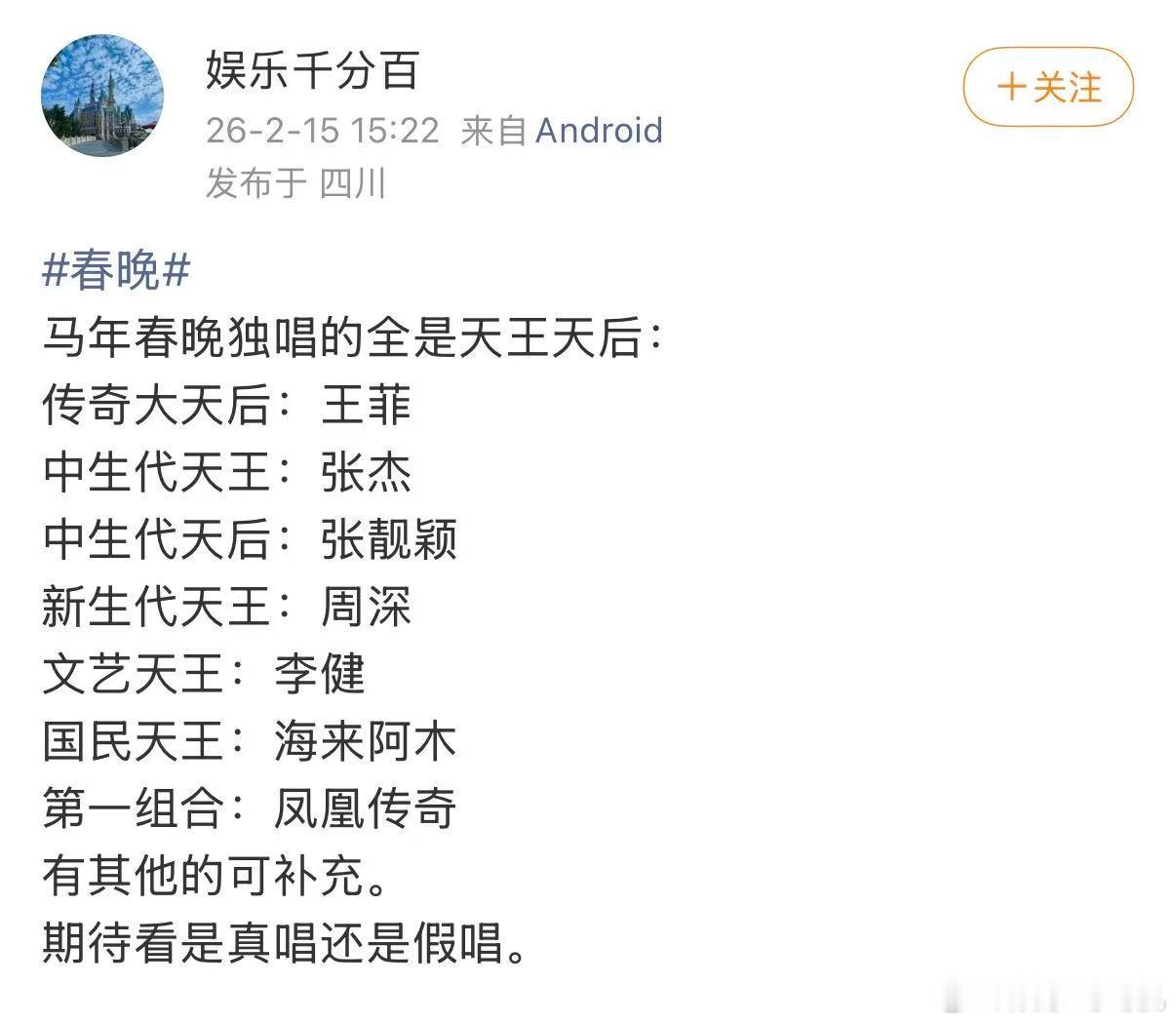 王菲凤凰传奇满屏雅俗通杀终于等到这波梦幻联动,王菲的细腻唱腔百听不厌,凤凰传奇的舞台感染力十足,两种风格完美融合在春晚舞台,提前预定除夕夜的热搜榜首。