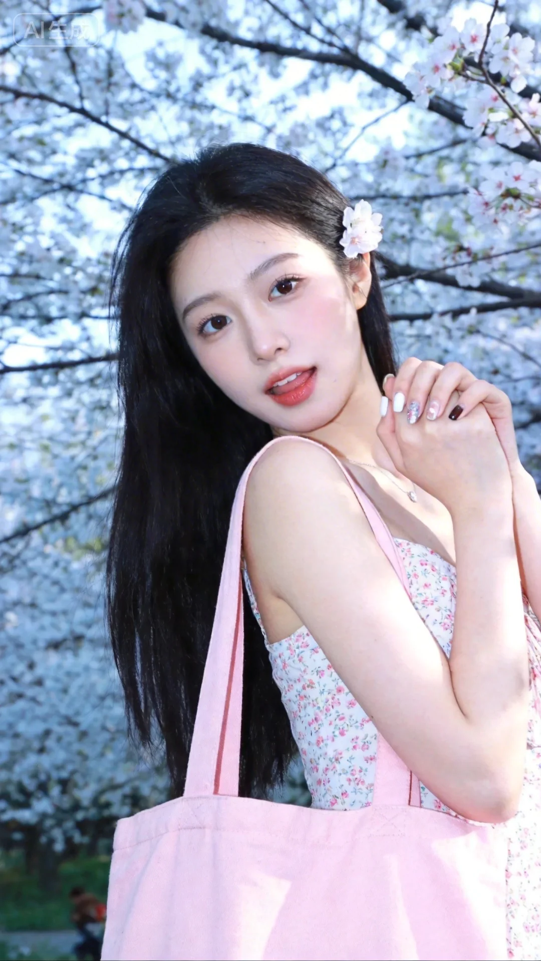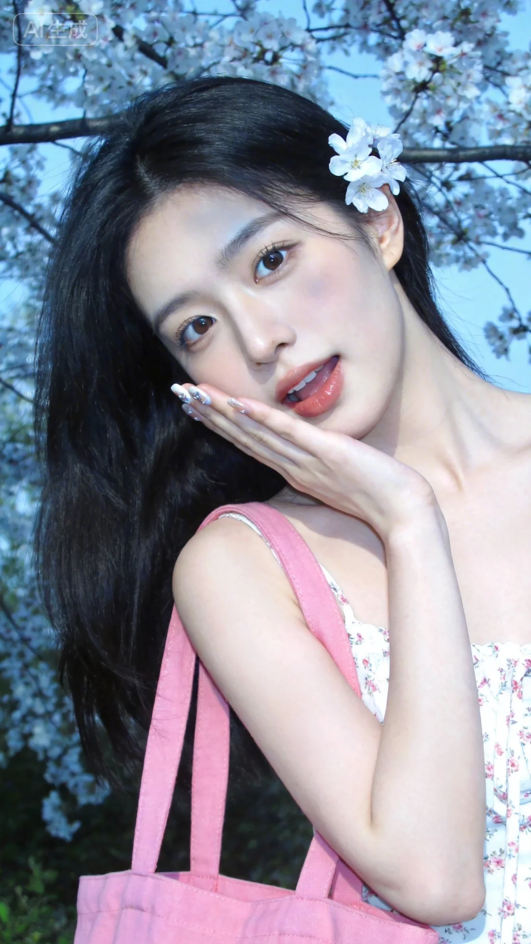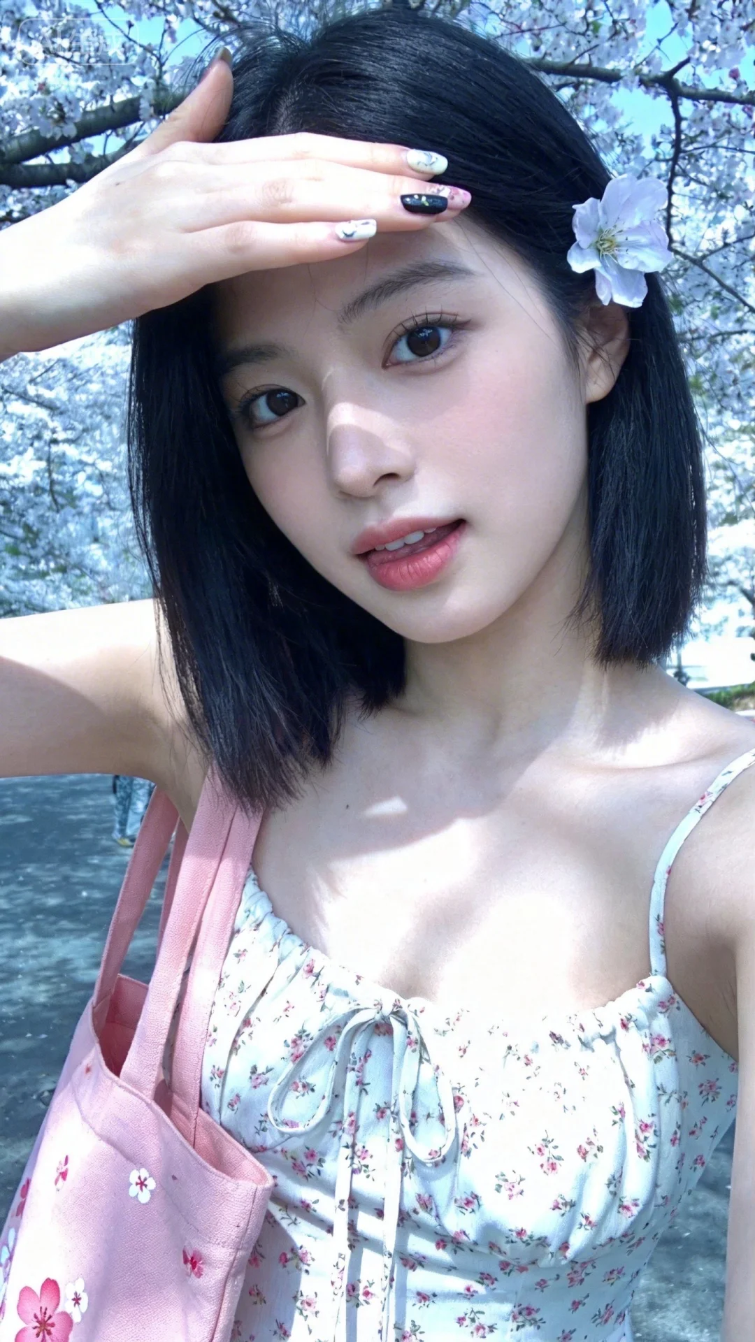 19岁韩国女生背着樱花粉的帆布包,少女感网拍iPhone拍摄,五官立体甜美,头上别了朵花,冷白皮,白嫩嫩的皮肤,明亮的眼神,高清人像摄影。网感,脸部衣服高清。背景与春天相符,小碎花连衣裙,纯欲风,偶像气质,fairskin,光滑,韩式自然妆容,随机美甲,随机的光影,随机角度拍摄,总体有很多的不确定性,但又好看,搭配又很合理,最高等级画质,IHD,美颜全开,超高清,32k分辨率,去掉一切噪点,冷色调,高曝光,高亮度。她表情可爱,摆出俏皮的动作,透着慵懒气息,采用微距镜头半身拍摄,聚焦于她上半身,将每一处细节都清晰展现,超细节呈现出她冷白、匀净、清透且细腻的皮肤。
