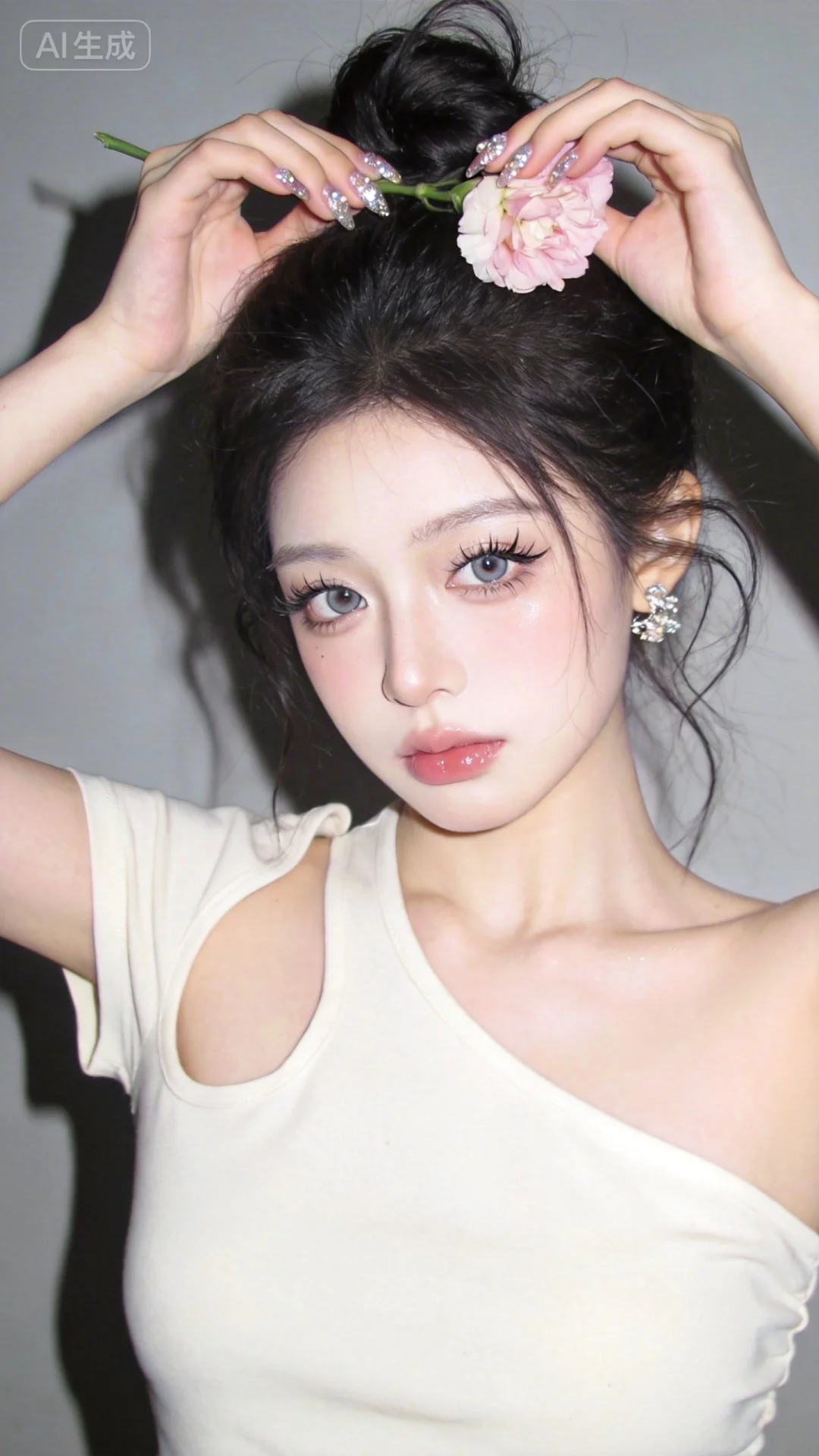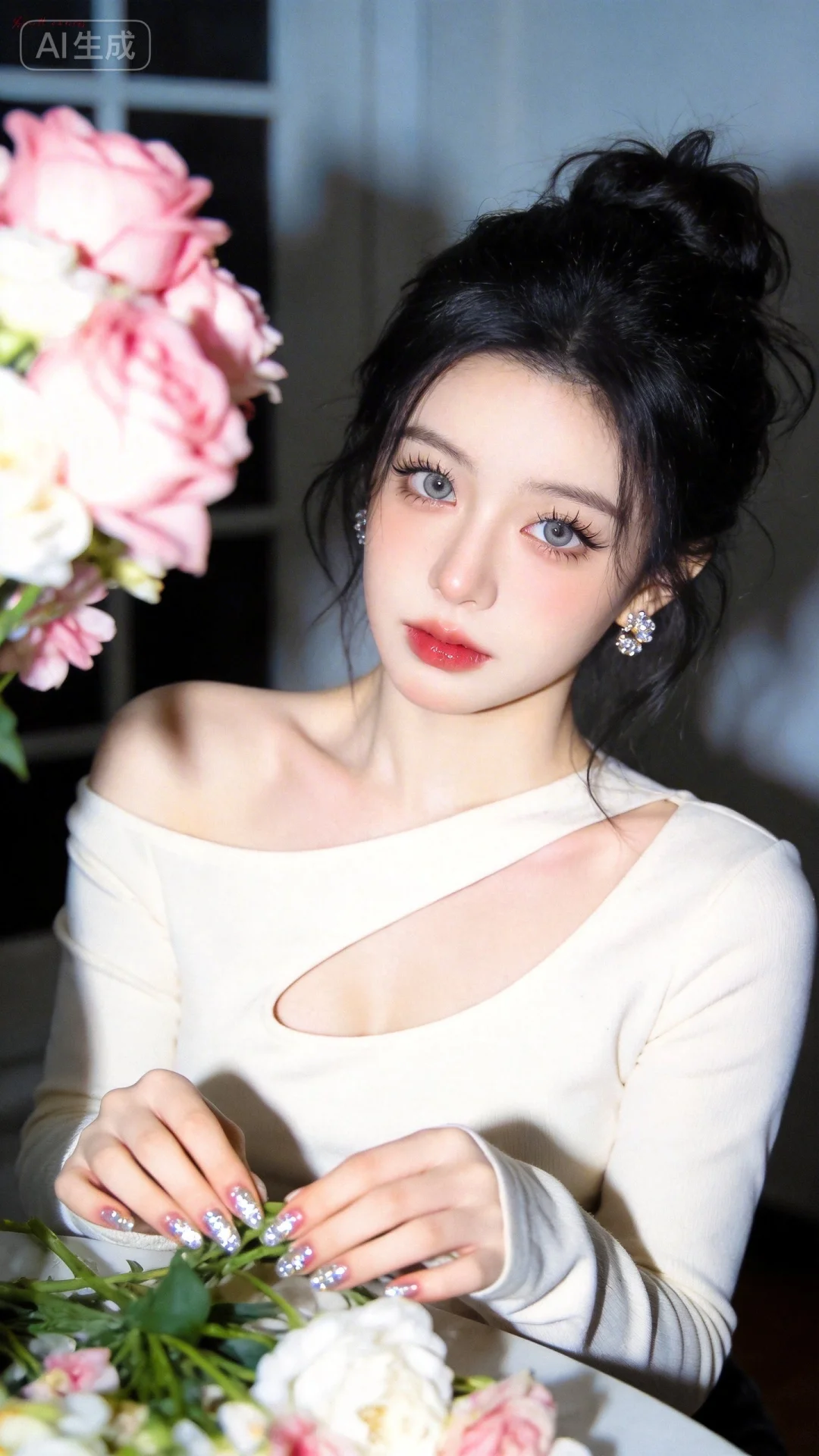 随手拍快照,噪点,抖动画面,冷白皮、瓷白肌肤配奶油白肌肤,有着无辜眼神,微醺神态自然松弛,慵懒松弛又带可爱表情,脸部轻微曝光,像洋娃娃一样可爱且有独特韵味,戴亮晶晶耳饰、做亮晶晶美甲,情绪氛围感拉满,聚焦眼睛尽显慵懒氛围感。米白色不规则修身上衣,无敌可爱萌,长发盘成松弛感慵懒感发髻,室内背景,伦勃朗光线,正在整理花朵,不看镜头,粉色调亮晶晶,睫毛纤长根根分明,自然微翘不浓密,无假感;下巴微收贴锁骨,肩颈舒展不低头,深灰色美瞳