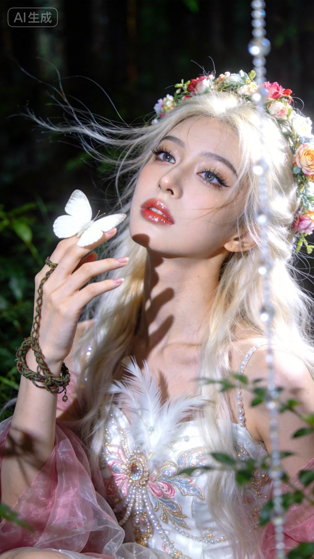 邀请镜中世界破碎,幽静的森林里慵懒地坐着一个金白长发女孩儿,与一只白色蝴蝶嬉戏,翩翩起舞精致的面庞,幽灵幻境,梦核,幽静,绿意盎然的空间,周围光线很暗,植物遮挡,人物面部处与画面最亮的部分,突出人物主体,弱化边缘背景,近实远虚,雾感光源,模糊,颗粒 雾感光源 斯文 御姐 低饱和度 雾感光源,森系少女。鲜花花环,藤蔓手环,暖光,细致