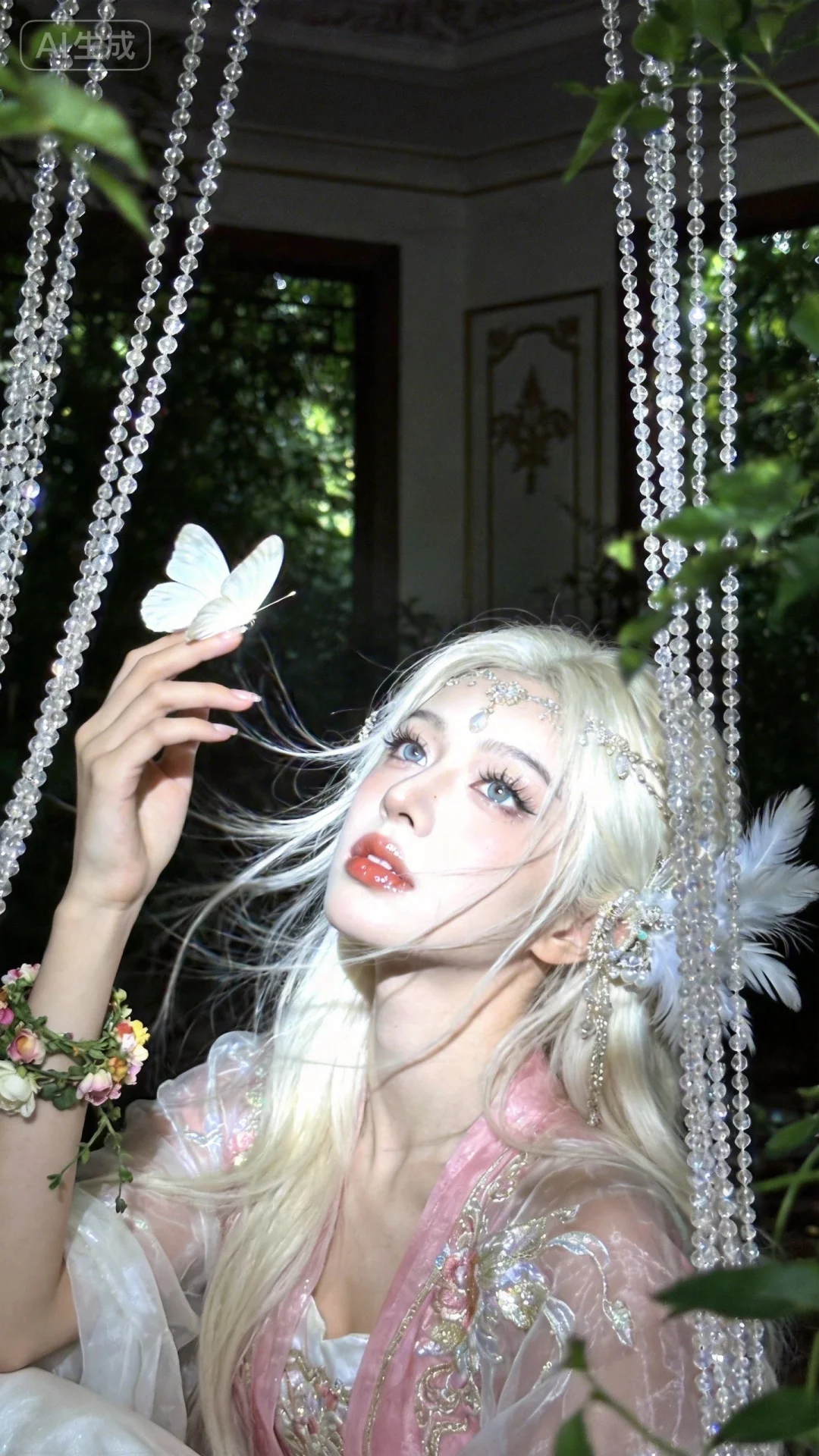 真人写真,极致高清,发丝根根分明,头发蓬松,发量多、厚。发丝拂面,发丝抽丝,发丝飘扬,头发高光、阴影,有层次感。有晕染感,艳丽、柔美,清瘦,高挑,古风美女,撩开珠帘,一眼万年。光晕。涂唇膏,晶莹光泽。鼻梁高挺,肤如凝脂,雪白肌肤。背景:贵族宅院房间。前景:珠帘。艺术感,动态感,时间定格,眼睛特写,亮晶晶。繁复精致的饰品,羽毛装饰,丝绸、欧根纱、刺绣、画面珠光感,绝美光影效果,粉白色系服饰,光影细腻。大师级构图,具有视觉冲击,精准透视。动作幅度大。五官精致精美,五官立体感强,五官高清,双眼皮,长睫毛。画风强势。大师级审美。脸部特写。