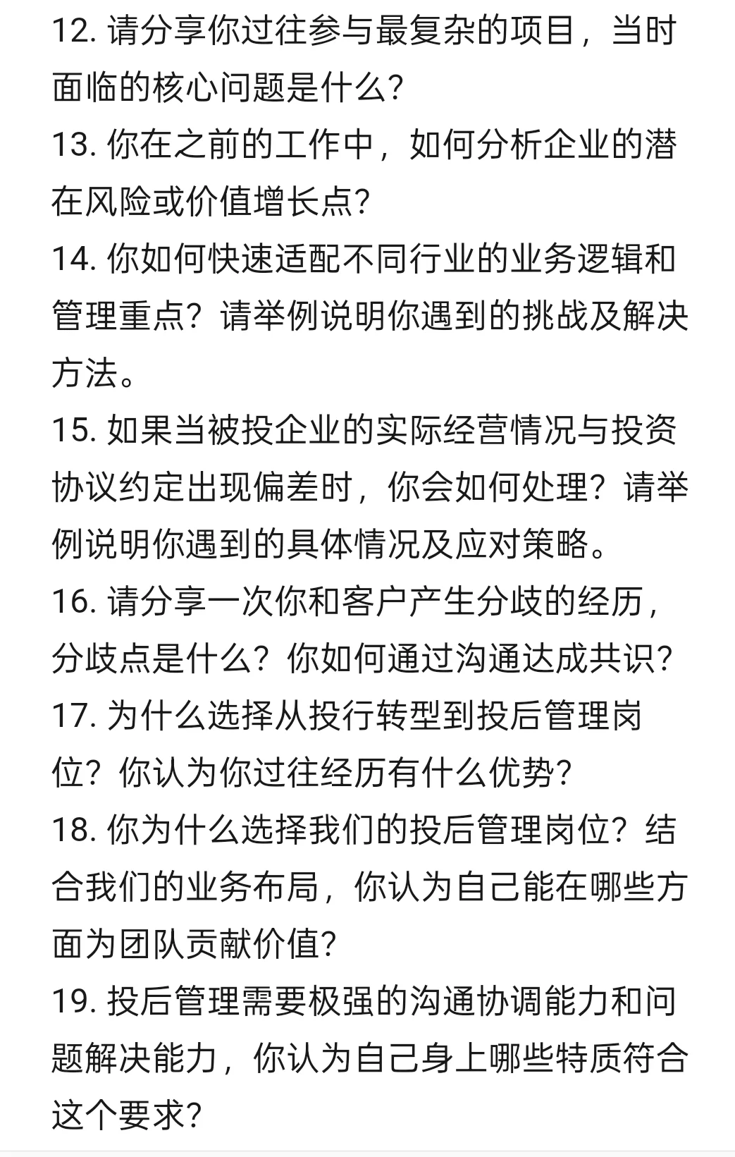 17. 为什么选择从投行转型到投后管理岗位?你认为你过往经历有什么优势?