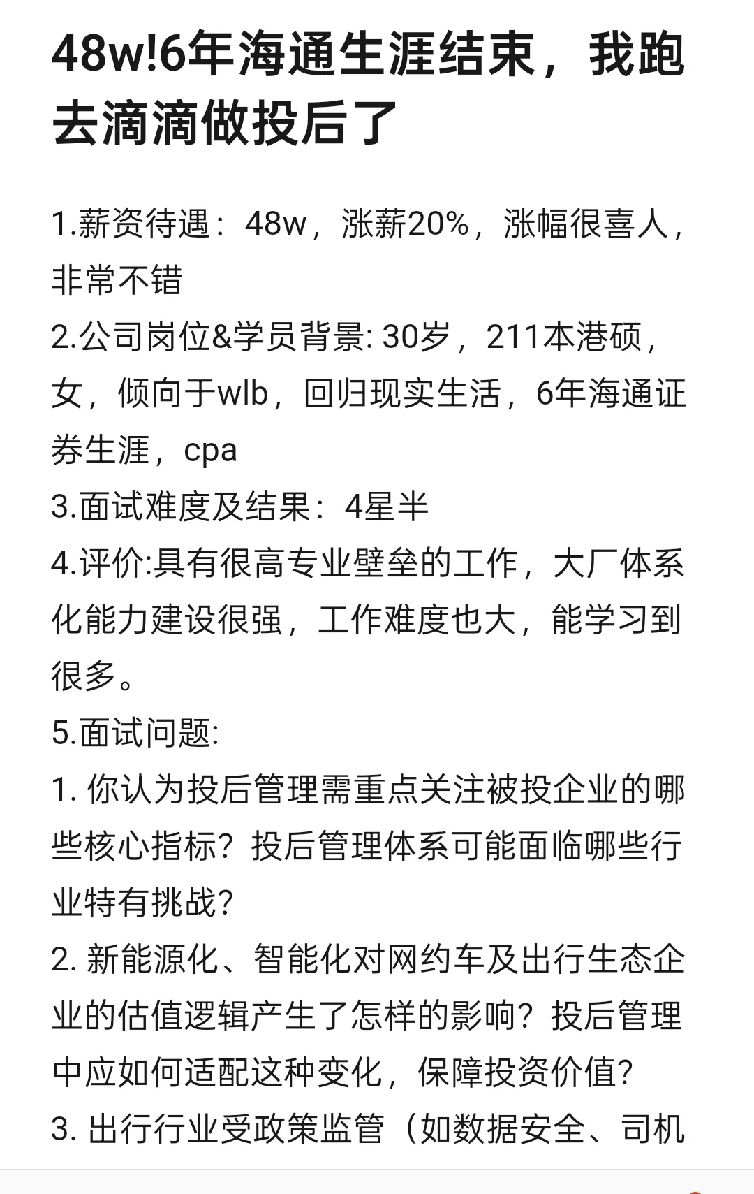 2.公司岗位&学员背景: 30岁,211本港硕,女,倾向于wlb,回归现实生活,6年海通证券生涯,cpa