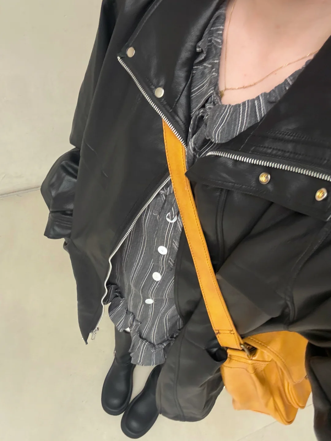 168/106左右 黑色和姜黄色的组合 很适合秋天 日常又带点小亮眼 不喜欢亮色系把包包换成黑色棕色白色都是可以的 配饰其实是起到一个点睛的作用 黄色的配饰也可以换成红色蓝色粉色白色紫色~ 只要有呼应就好 黑色皮衣的穿搭思路我之前有发过的 但是没有搭配长筒靴露腿的搭配 之前有姐妹还挺想看的我就拍了 我觉得这种搭配很适合小个子 非常显比例 不喜欢露腿可以穿打底裤(黑色或者光腿神器都可以) 这套不会特别冻腿哦 秋天穿是差不多的 如果天气再冷一点的话 就考虑穿白色直筒裤 或者卡其色的裤子~