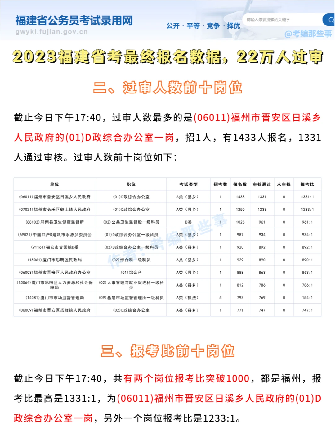 截止今日下午17:40,共有两个岗位报考比突破1000,都是福州,报考比zui高是1331:1,为(06011)福州市晋安区日溪乡人民政.府的(01)D政综合办公室一岗,另外一个岗位报考比是1233:1。