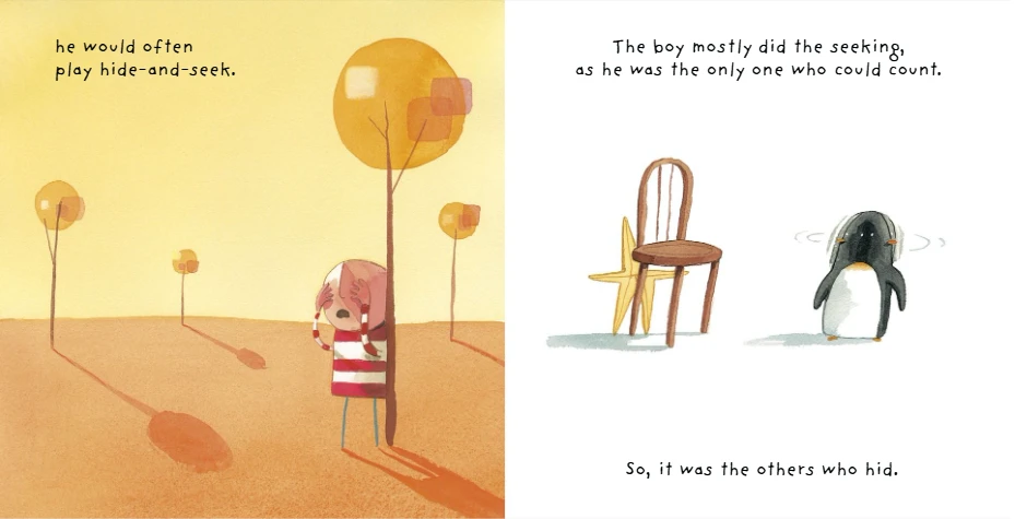 小男孩最喜欢和好朋友星星与企鹅一起玩捉迷藏,星星不擅长躲藏,总是一下子就被找到。有一天他们又一起玩最喜欢的游戏,可是这次小男孩却怎么找也找不到星星……