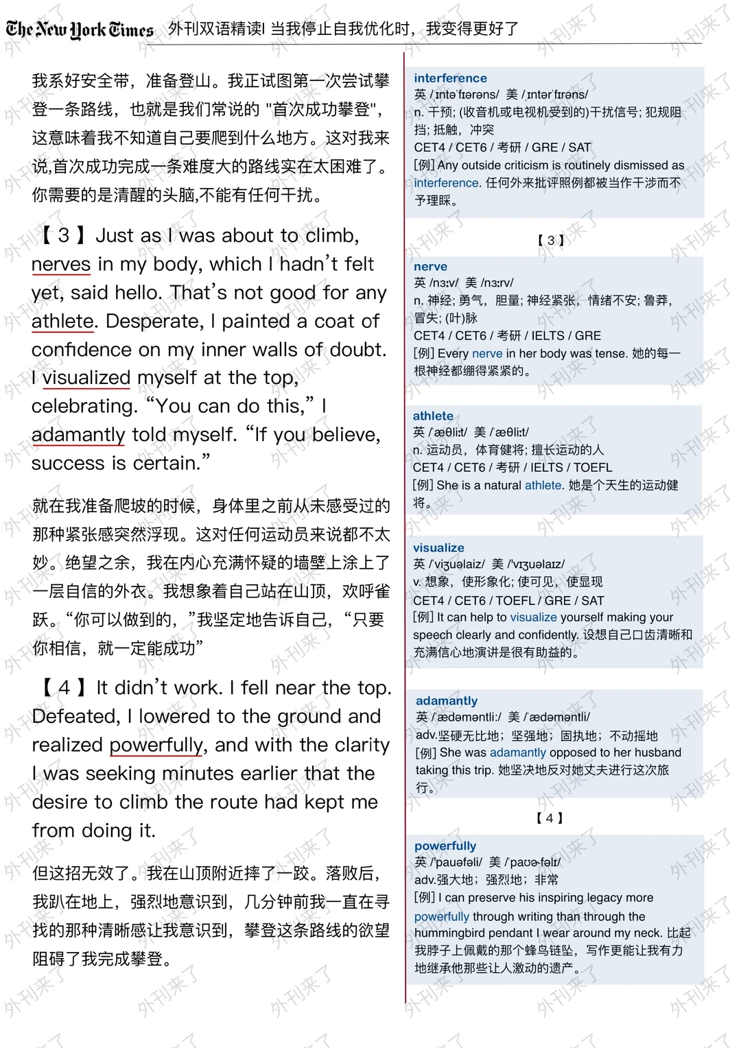 🔥英语学习必备的外刊精读 ⭐选自The New York Times ⭐每周会从原刊中选取多篇文章精读 🏆🏆重点单词⤵️ 🏅cliff 悬崖 🏅stunner 绝妙的东西 🏅loiter 虚度闲荡 🏅interference 干预 🏅nerve 神经 🏅visualize 使形象化 🏅adamantly 坚定地 🏅powerfully 强烈地 🏅anticipation 预期