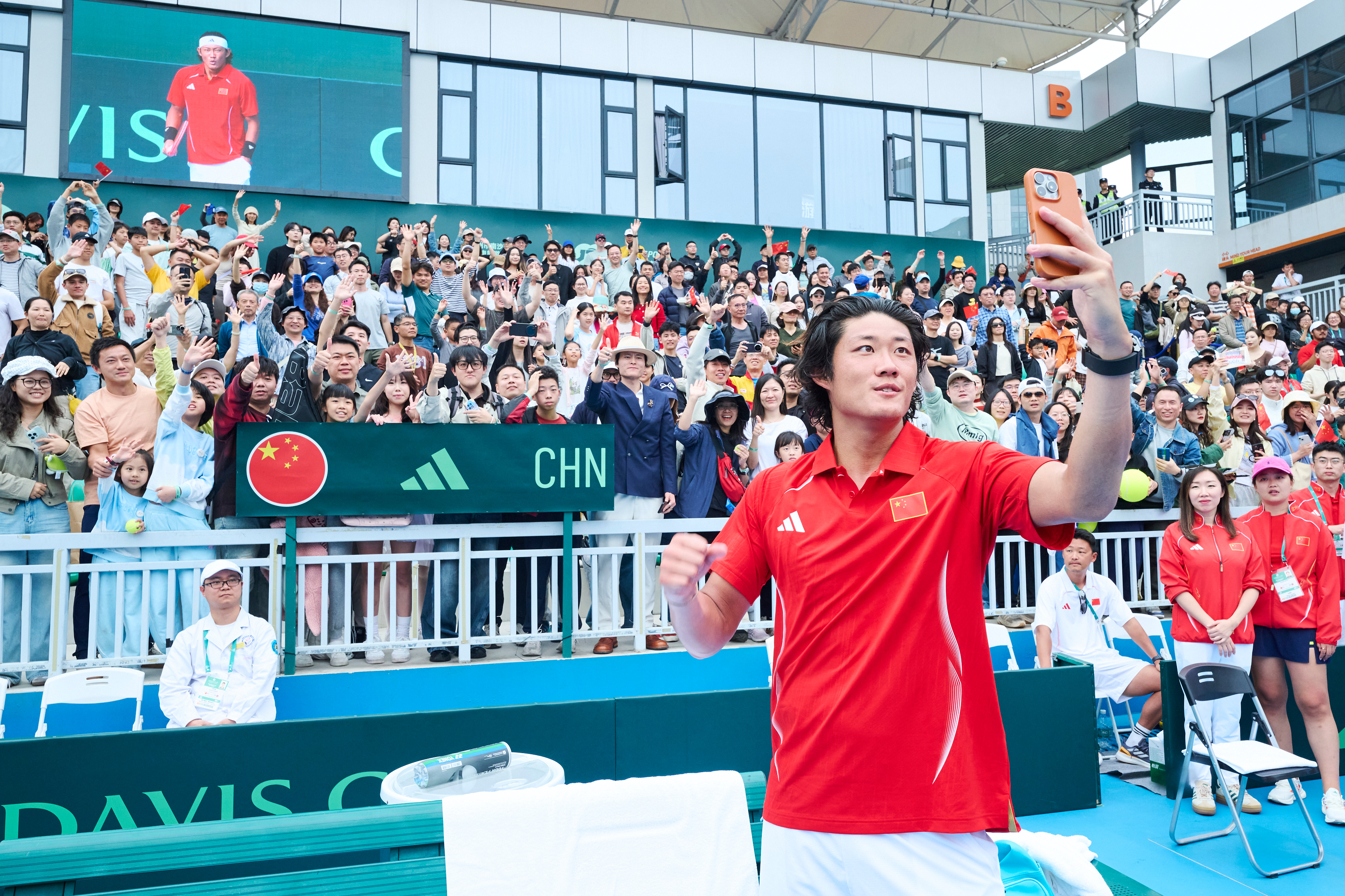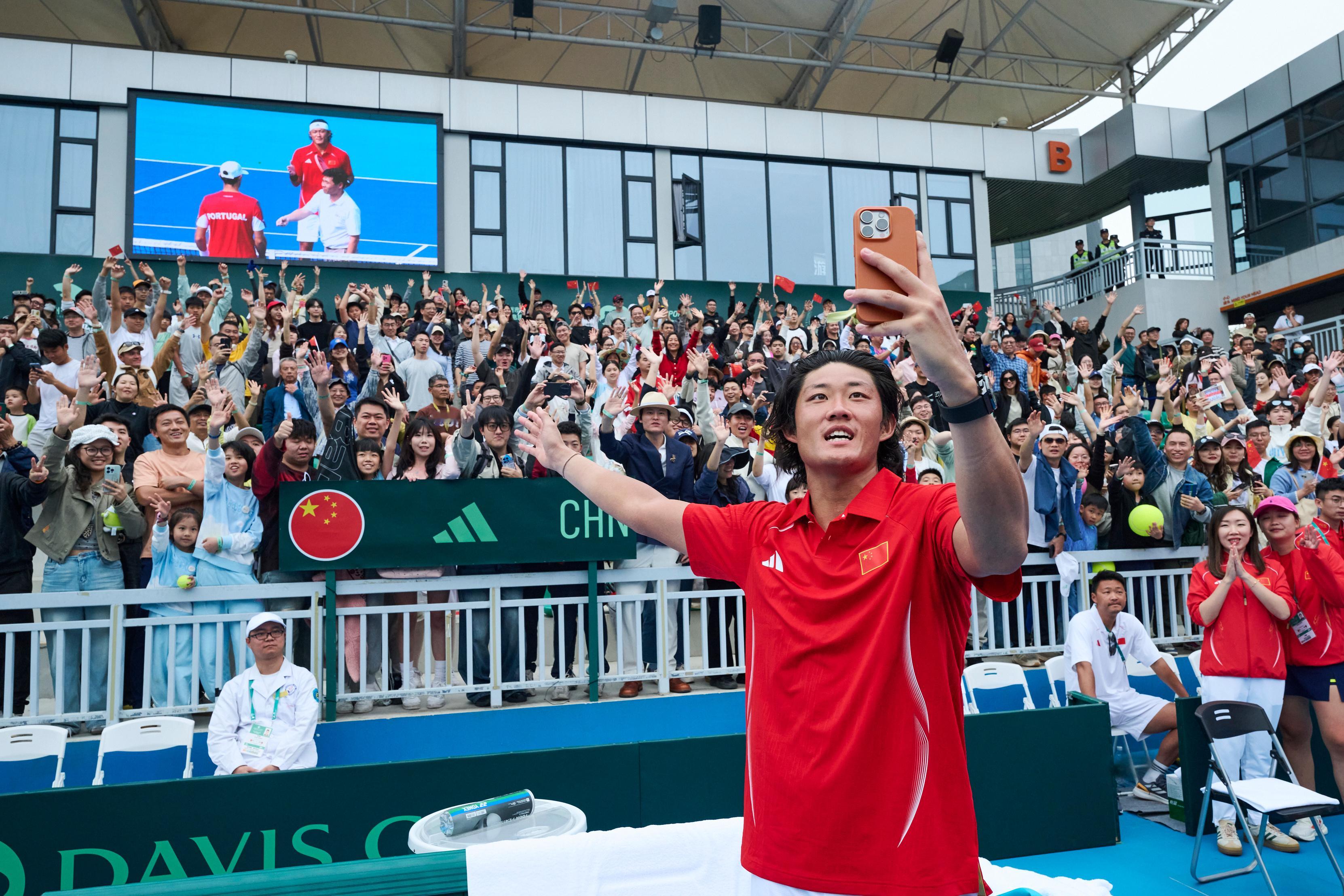 为中国队敲定戴维斯杯胜局的功臣张之臻和球迷自拍组图!有在现场同框合影出镜的球迷吗
