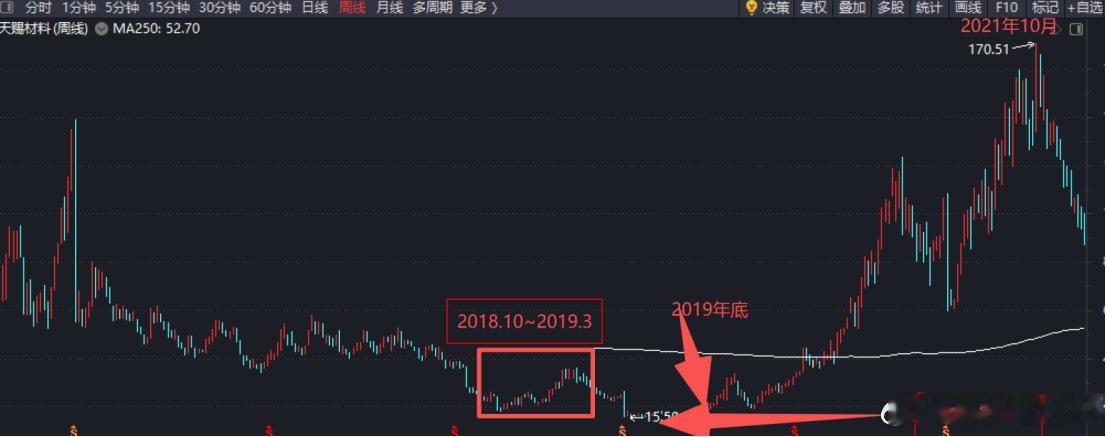 与设备同期见底的还有上游锂矿。比如上表的“亿纬锂能”“天赐材料”均在2018年10月份见底,涨至2019年3月,涨幅均为一倍涨幅。如图:
