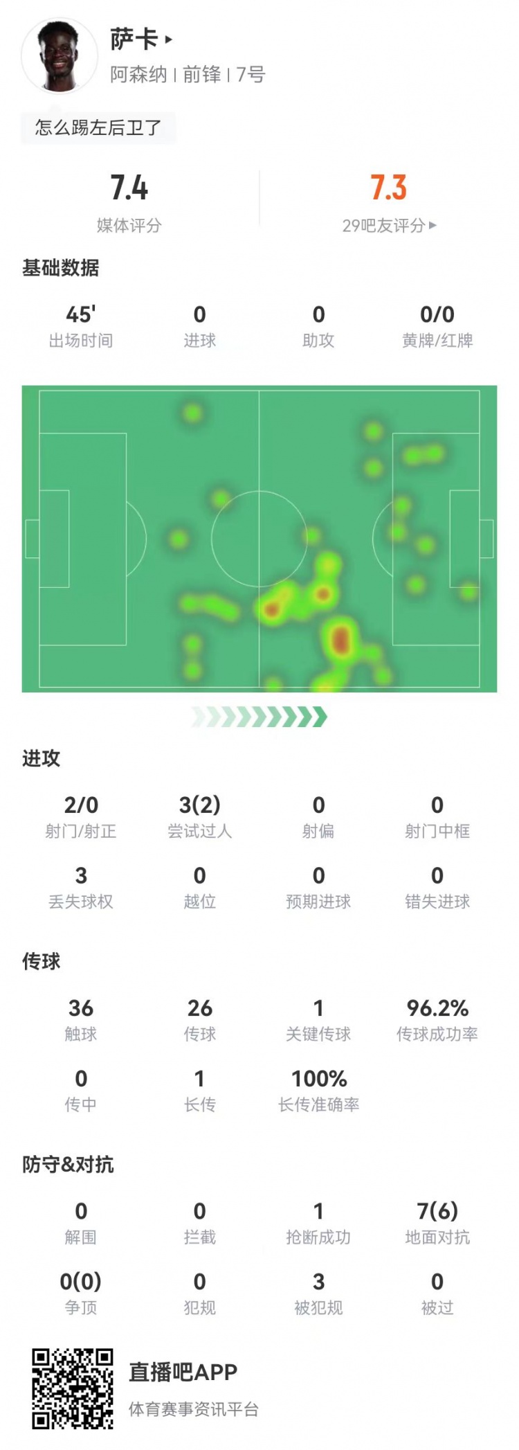 直播吧2月16日讯阿森纳在本轮足总杯4-0大胜维冈竞技,萨卡本场数据如下: