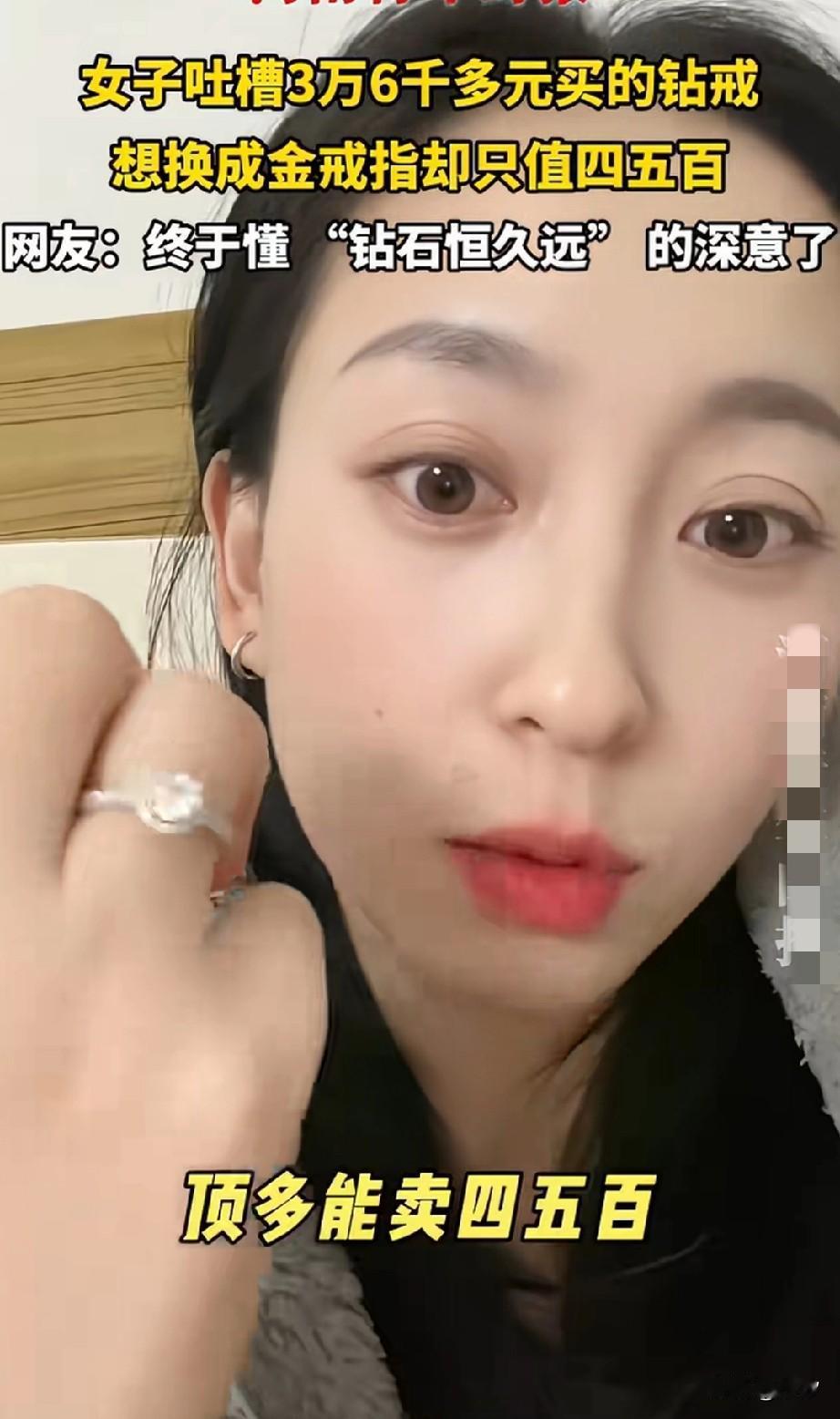 女子看着如今的金价这么高, 又看着自己手上的钻戒, 就开始疯狂吐槽自己的老公, 结婚的时候非要给自己买这个钻戒, 花了36000块钱, 当时觉得挺好看的, 也没有阻止自己的老公, 现在想拿这些首饰去换一些黄金首饰, 结果问了之后才知几百块钱, 这瞬间让她破了防, 他表示工作人员本来还不想要, 看得上它这个钻戒框铂金, 这才给它说值几百块钱, 她这款钻戒中间是一颗大钻戒, 周围是小钻戒,而且还是在香港买的, 按理说应该很贵, 但没想到数年过去之后, 钻戒居然这么不值钱了, 自己现在也是非常后悔, 有网友看到她的经历后表示, 终于懂钻石恒久远的真意了! 由于人工可以合成钻石, 造成现在的钻石简直是白菜价, 结婚的时候不如买点金条, 这样不仅保持增值,还耐看, 大家对于女子后悔结婚时买钻戒没买黄金怎么看? 婚姻与家庭 手镯金价