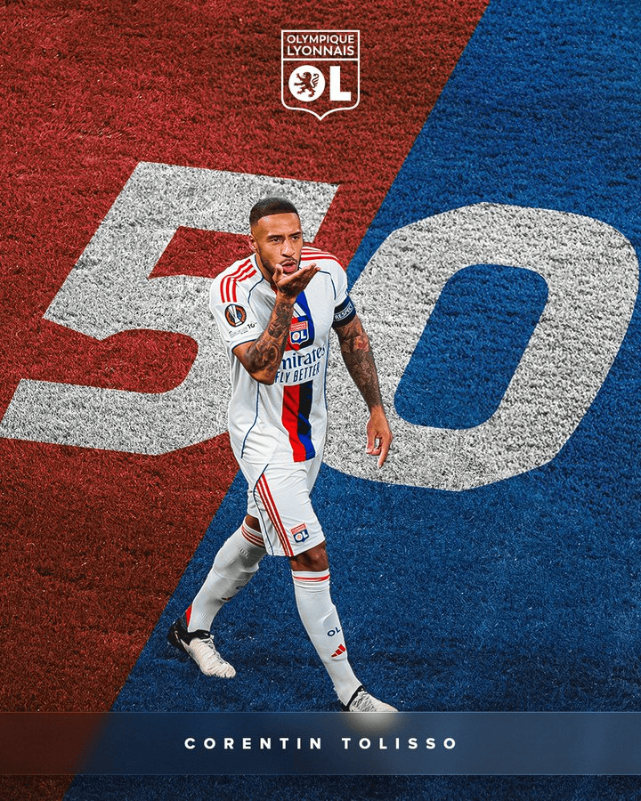 托利索达成里昂生涯50球里程碑,俱乐部官方发布纪念海报