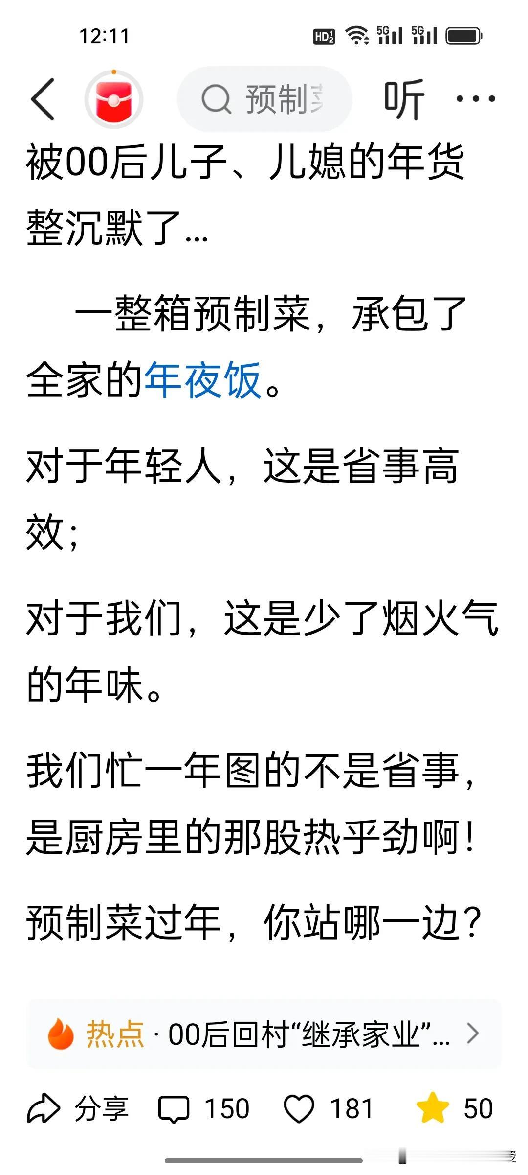 预制菜年夜饭,真的就没年味了吗? 今天刷视频,看到不少年轻网友都炫起了预制菜年夜饭,可是长辈们看着满桌预制菜沉默,觉得少了烟火气,可这恰恰体现的是年轻人的懂事。 不必再为年夜饭绞尽脑汁,不用在厨房忙碌到深夜,省去备菜烹饪的繁琐,把时间留给陪伴。年轻人在外工作早已不易,预制菜不是敷衍,是换种方式团圆。 年味从不是灶台的烟火独舞,而是一家人围坐的欢声笑语。体谅彼此的不易,就是最浓的年味。