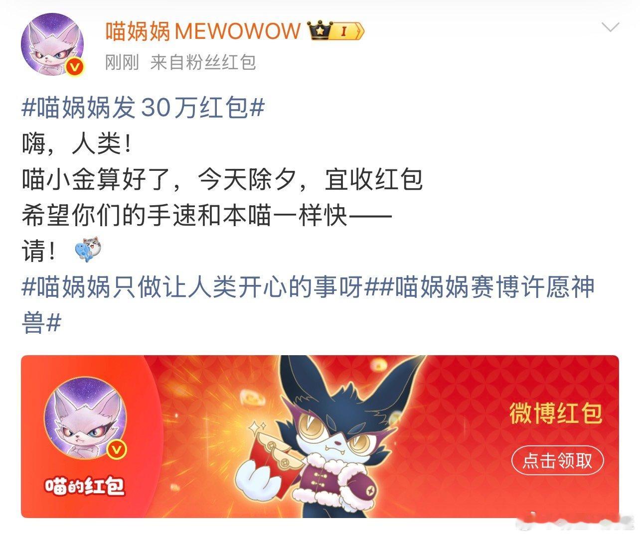 喵娲娲发30万红包 除夕红包天花板来啦!喵娲娲30万福利暴击,手速党快集合,新年顺风顺水就靠这波啦🚀喵娲娲只做让人类开心的事呀 喵娲娲赛博许愿神兽