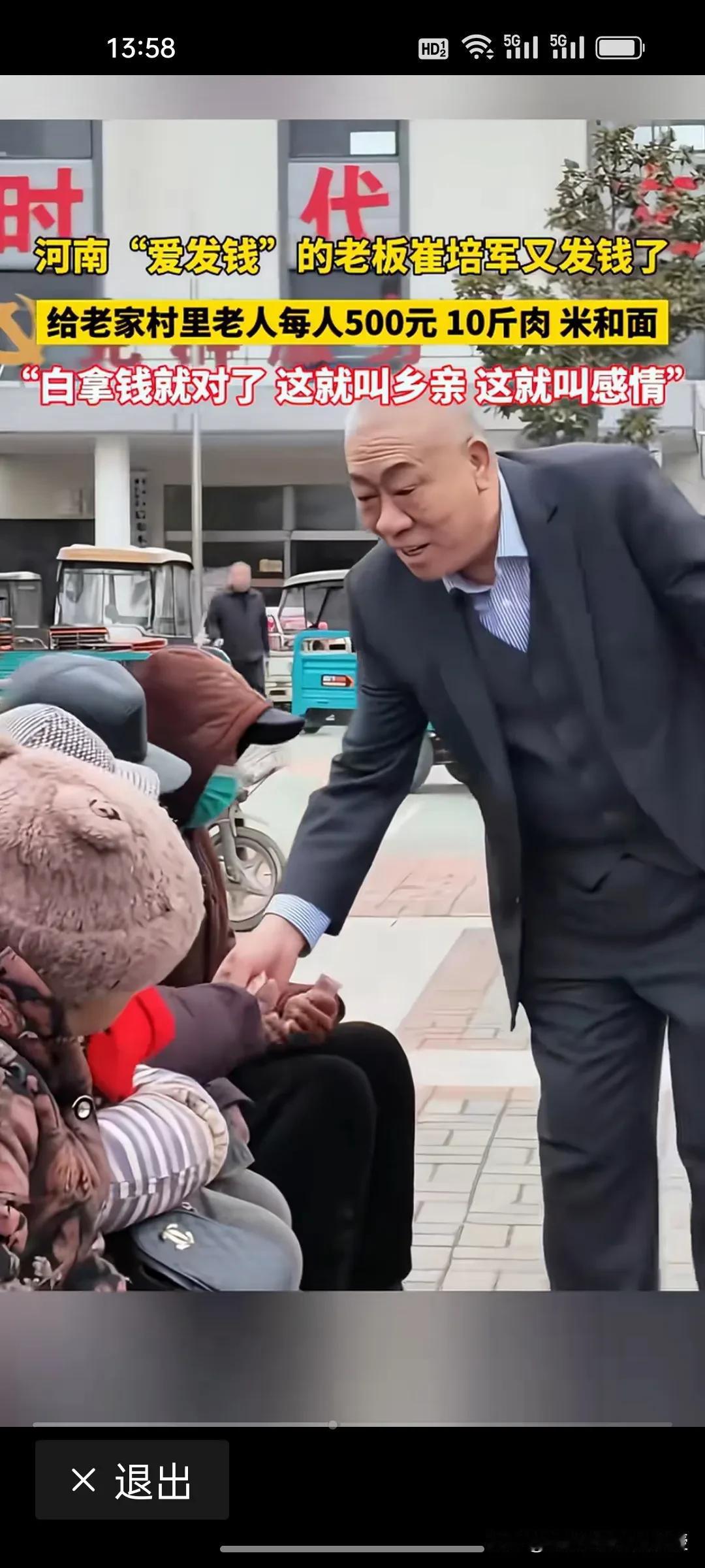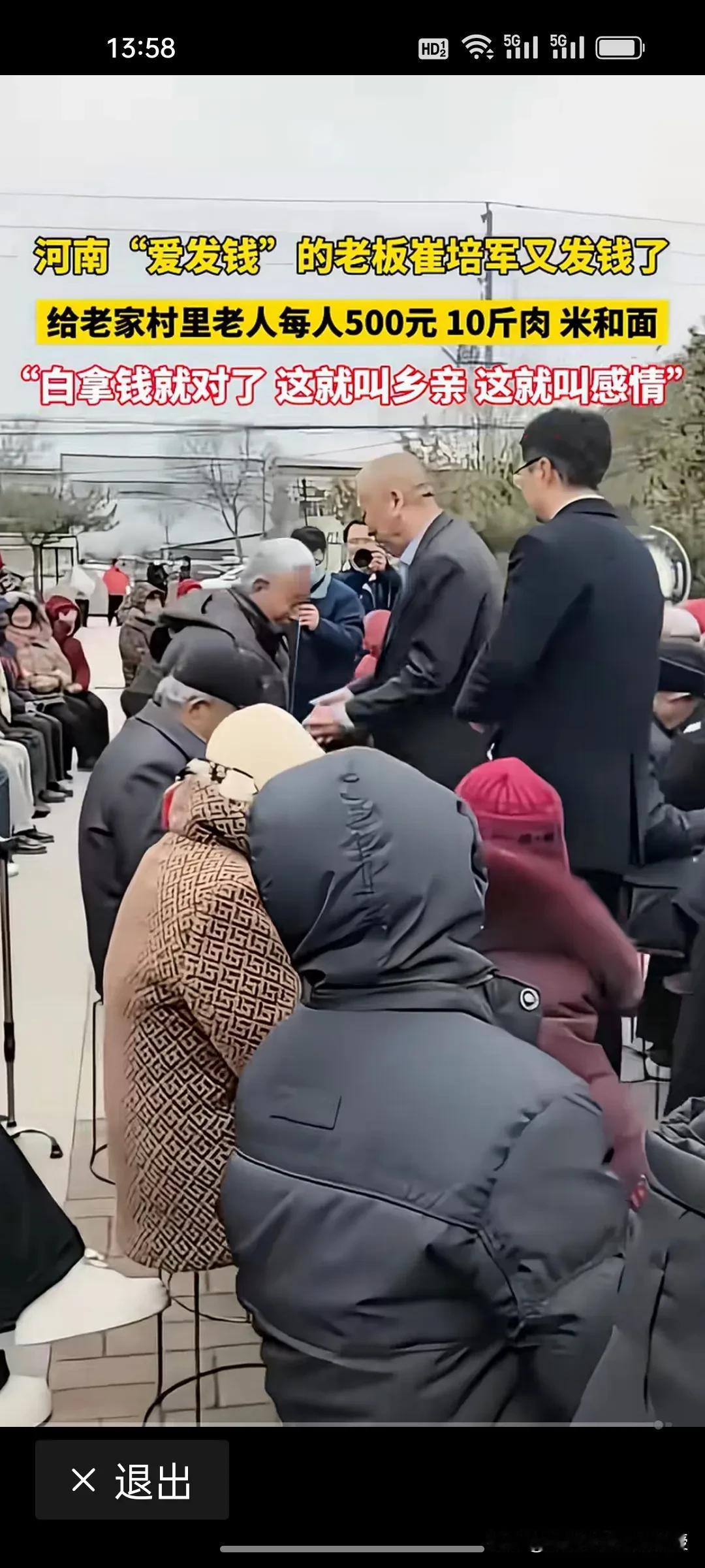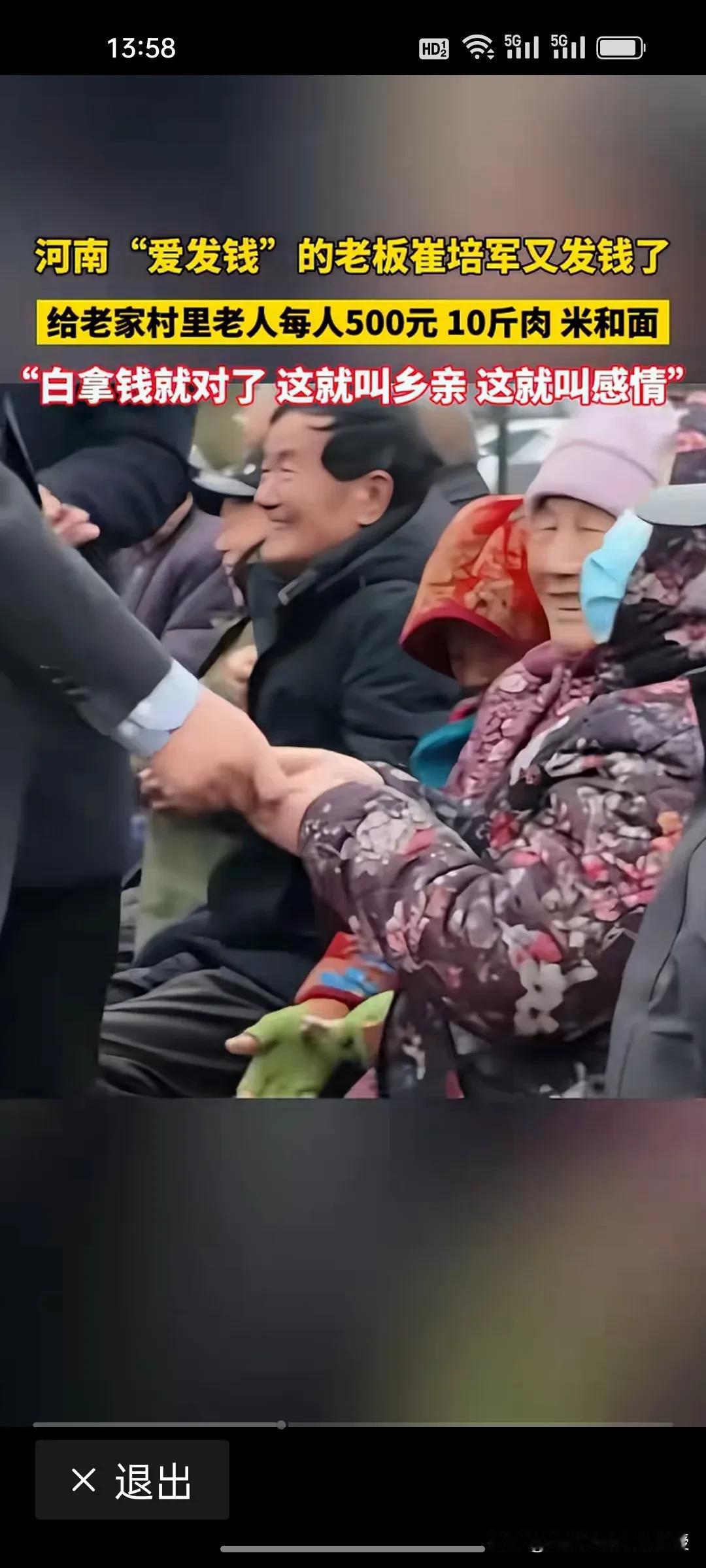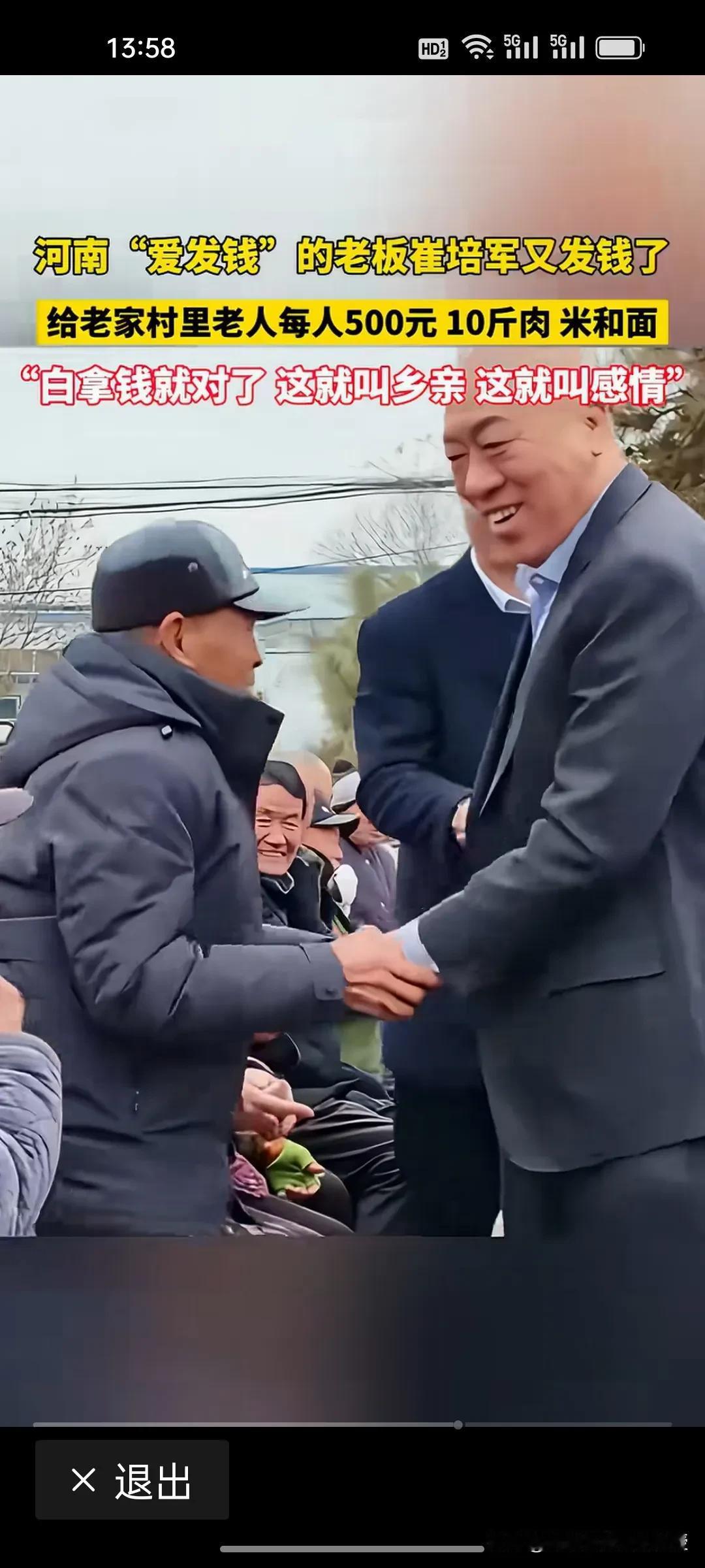 刘强东式企业家越来越多,崔培军回家乡后给老人们发钱时说的一句“白拿钱就对了”太暖了! 崔培军不仅对员工大方,回村给老人发福利更是毫不含糊:每人500元现金,再加10斤肉、米和面。面对乡亲们的不好意思,他笑着说:“白拿就对了,这就叫乡亲,这就叫感情!” 从员工福利到乡邻关怀,这样的企业家格局,才是真正的榜样。这样的“发钱”,发的是心意,暖的是人心。[给力][心]