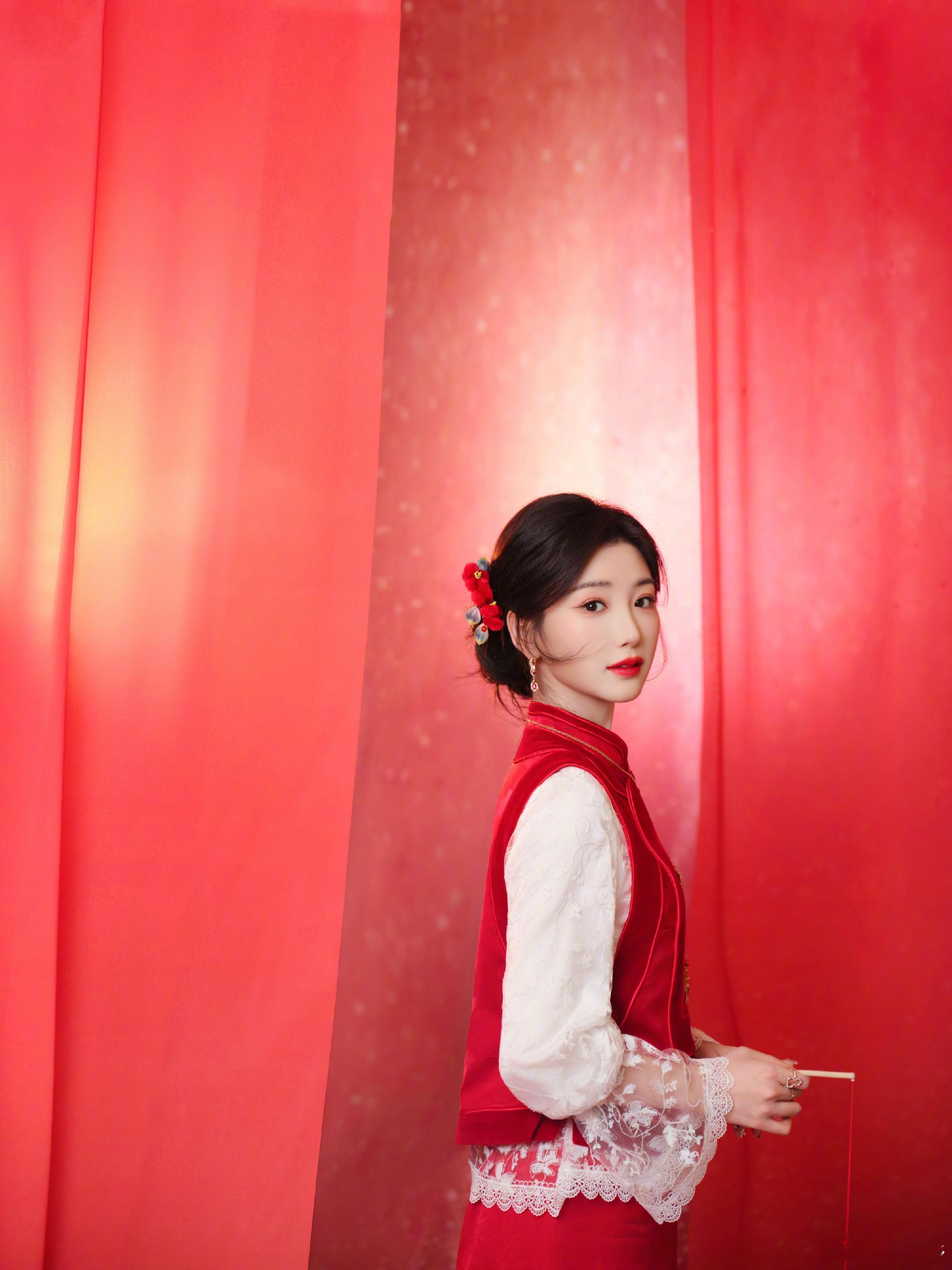 毛晓彤生日过年一起快乐生日撞上除夕,是双倍的喜庆!红金马甲配白纱裙,精致得像年画