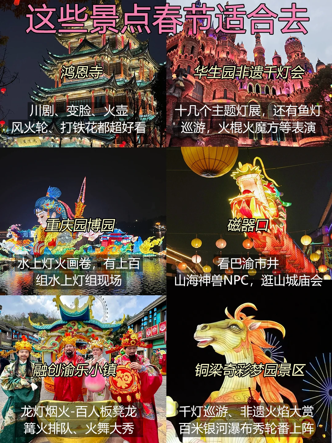 2⃣️磁器口古镇:免费,巴渝老牌古镇。春节有山城庙会、神兽主题巡游、非遗展演